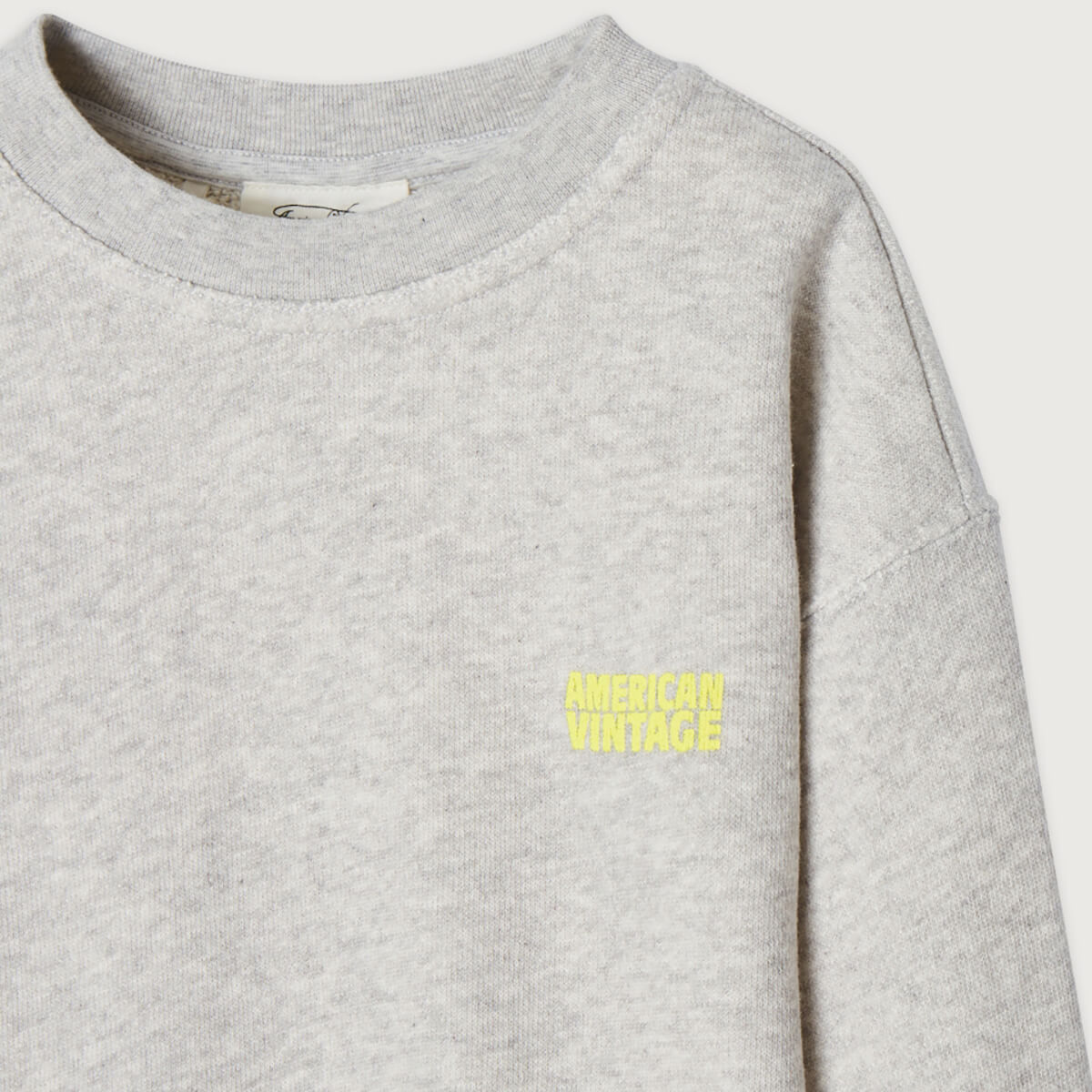 Kodytown kid's sweatshirt by American Vintage. Straight cut organic cotton sweatshirt with a round neck and dropped shoulders. American Vintage logo in yellow printed on the chest.
