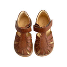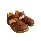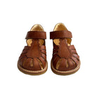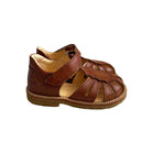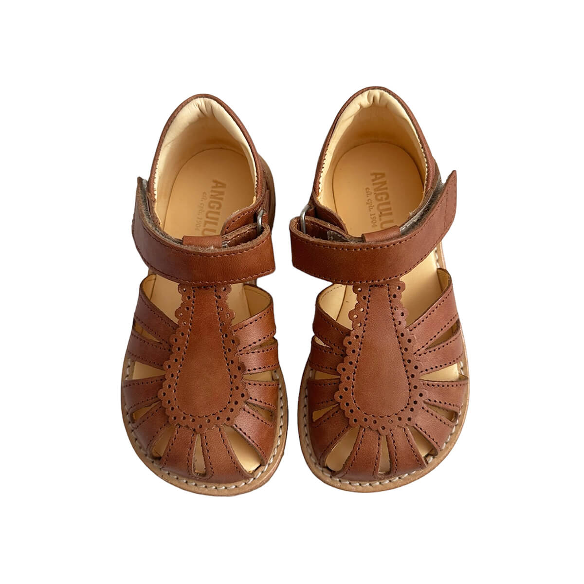 Leather sandals by Angulus. Sandal with scallop details and adjustable velcro strap. Closed toe and solid heel cap for maximum support. Soft and flexible crepe rubber sole. Lined with 100% chrome-free leather.