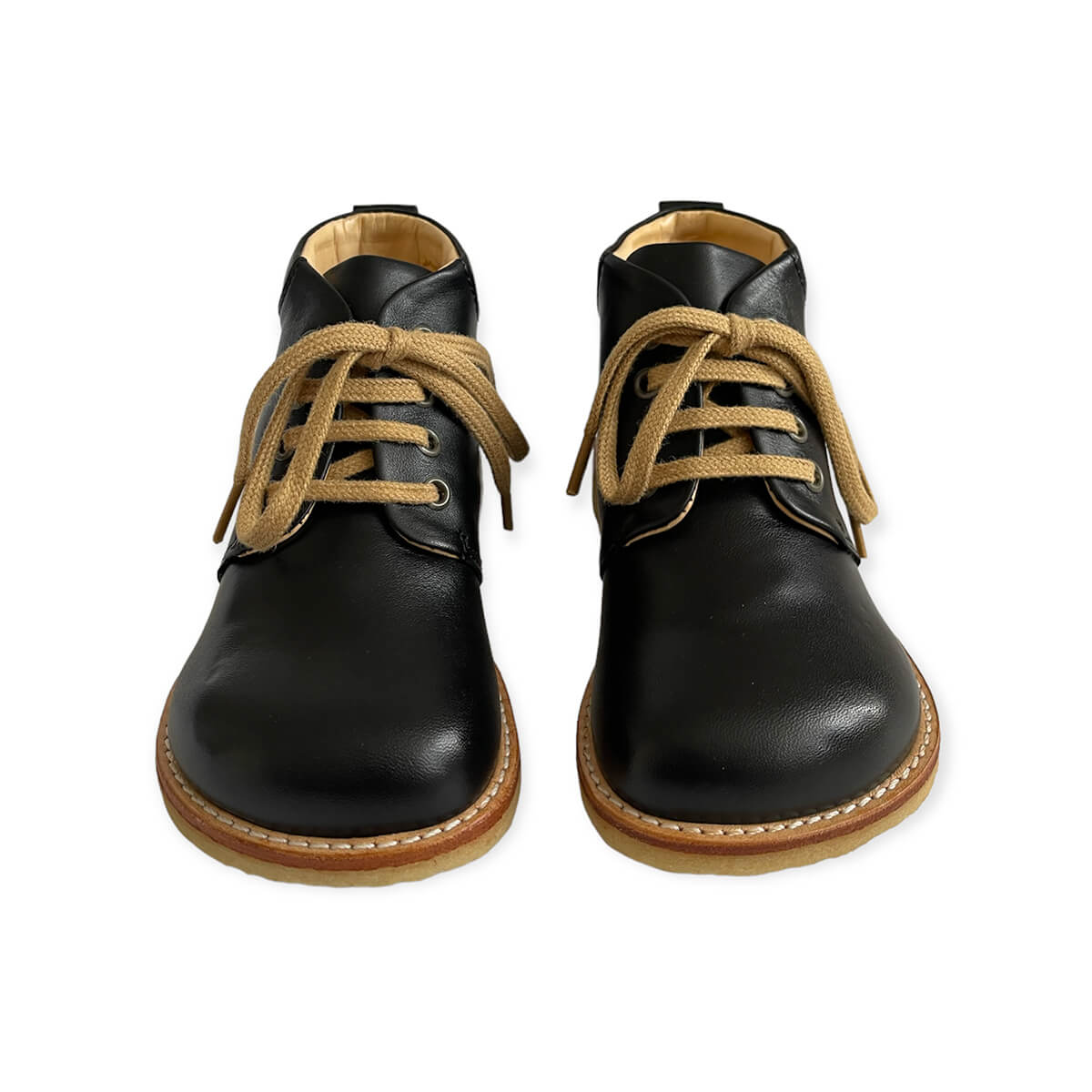 Wide fit lace-up desert boots by Angulus. Lace up boots on a wide last with plenty of space for growing toes. Wide toe and solid heel cap for maximum support. Soft and flexible crepe rubber sole. Lined with 100% chrome-free leather.