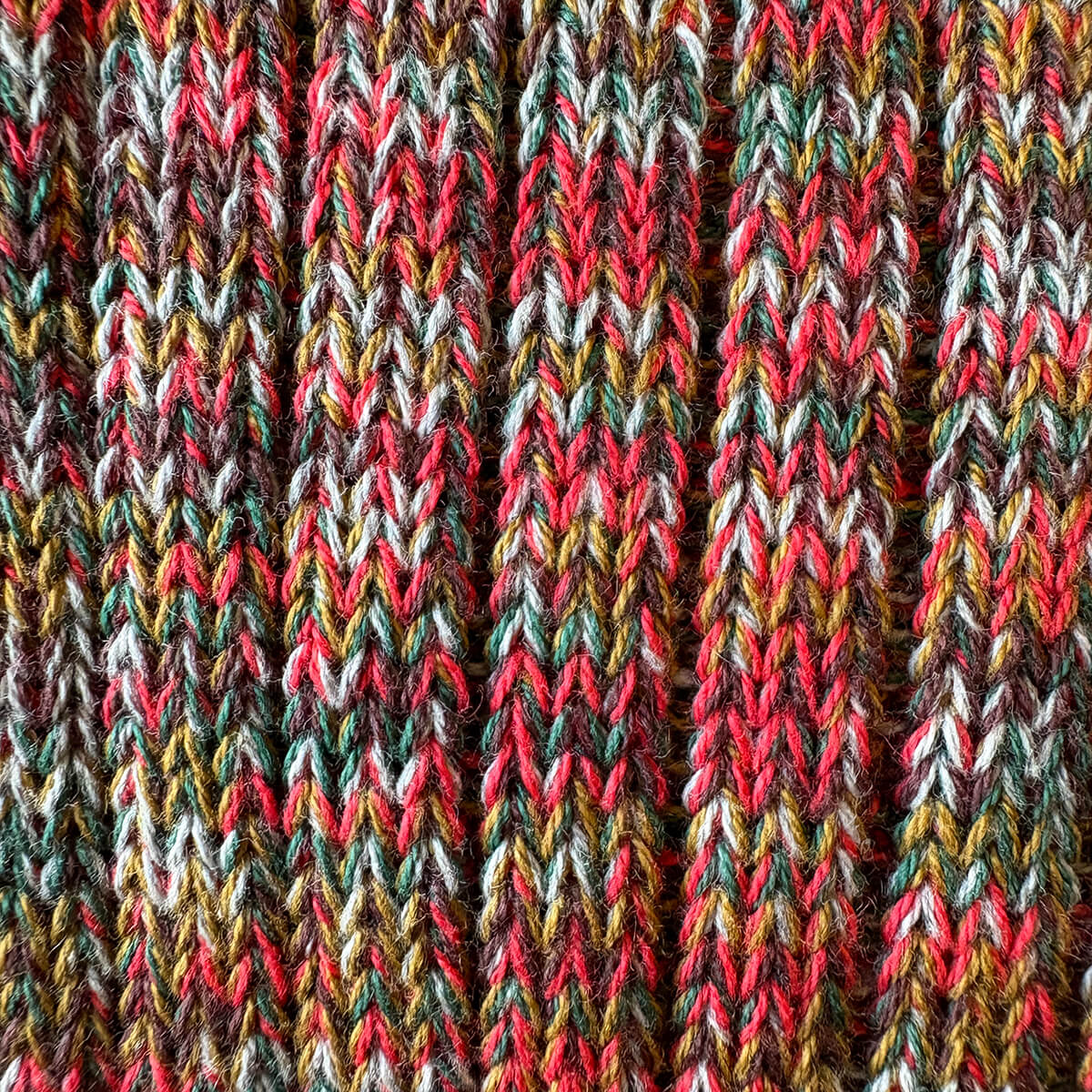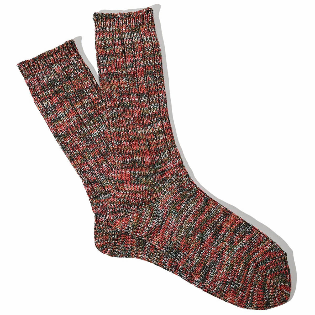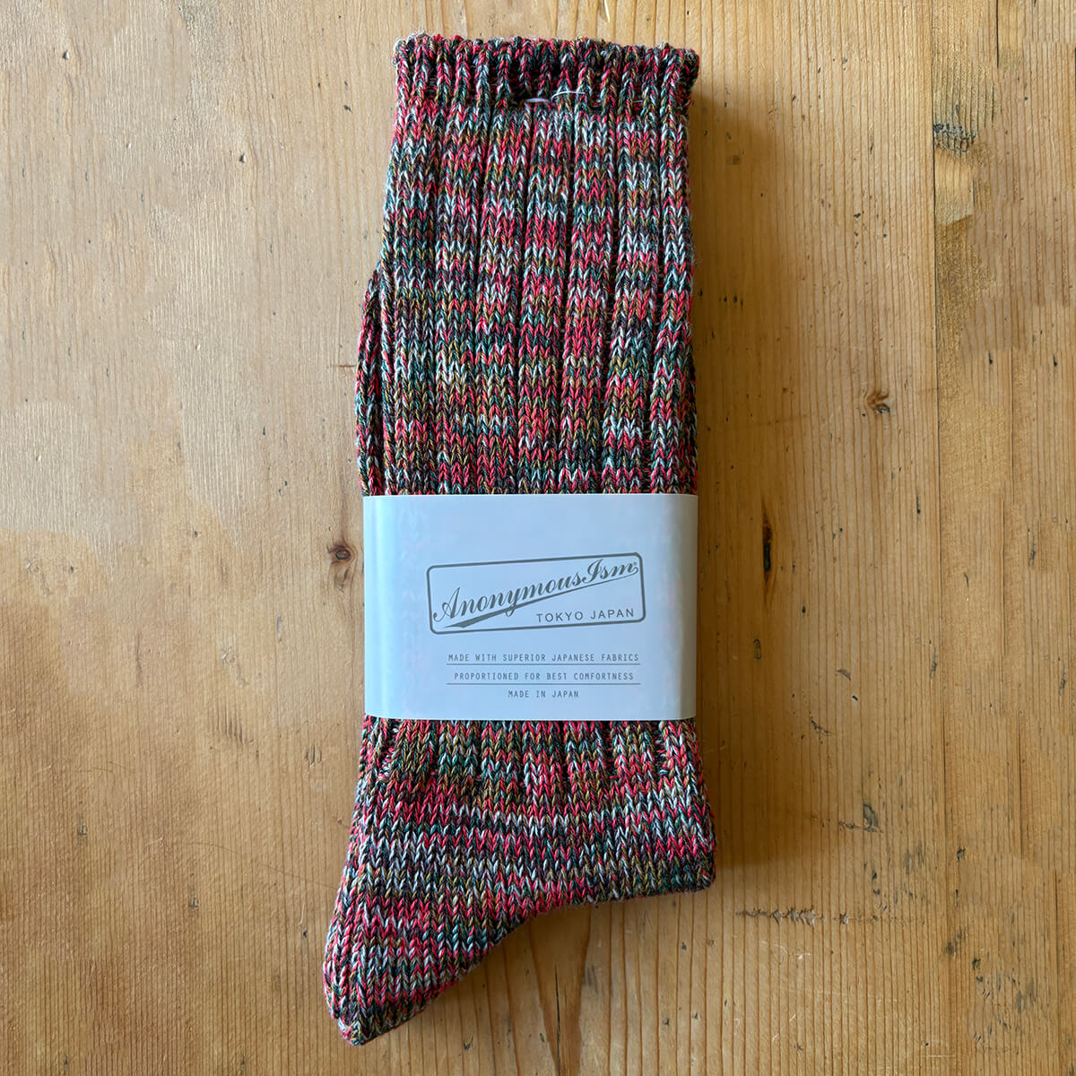 5 Colour Mix Crew Adult Socks by Anonymous Ism. The 5 colour mix crew is a medium-weight, chunky knit sock with a bouncy feel to the yarn and a supremely comfortable ribbed top. This is a signature piece from Anonymous Ism, blending craftsmanship with quality. The knitted fabric is carefully crafted using a unique over-gauge technique on low-gauge machines, achieving a perfect balance of softness, thickness, and durability. Made with vibrant, high-quality combed yarn, the socks reveal a rich, colourful pattern as the five hues intertwine beautifully, creating a distinctive and dynamic look.