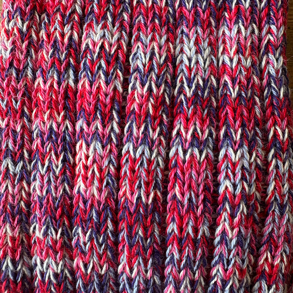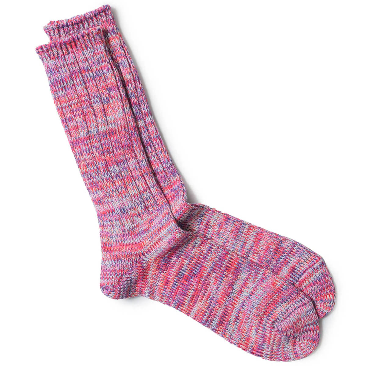 5 Colour Mix Crew Adult Socks by Anonymous Ism. The 5 colour mix crew is a medium-weight, chunky knit sock with a bouncy feel to the yarn and a supremely comfortable ribbed top. This is a signature piece from Anonymous Ism, blending craftsmanship with quality. The knitted fabric is carefully crafted using a unique over-gauge technique on low-gauge machines, achieving a perfect balance of softness, thickness, and durability. Made with vibrant, high-quality combed yarn, the socks reveal a rich, colourful pattern as the five hues intertwine beautifully, creating a distinctive and dynamic look.