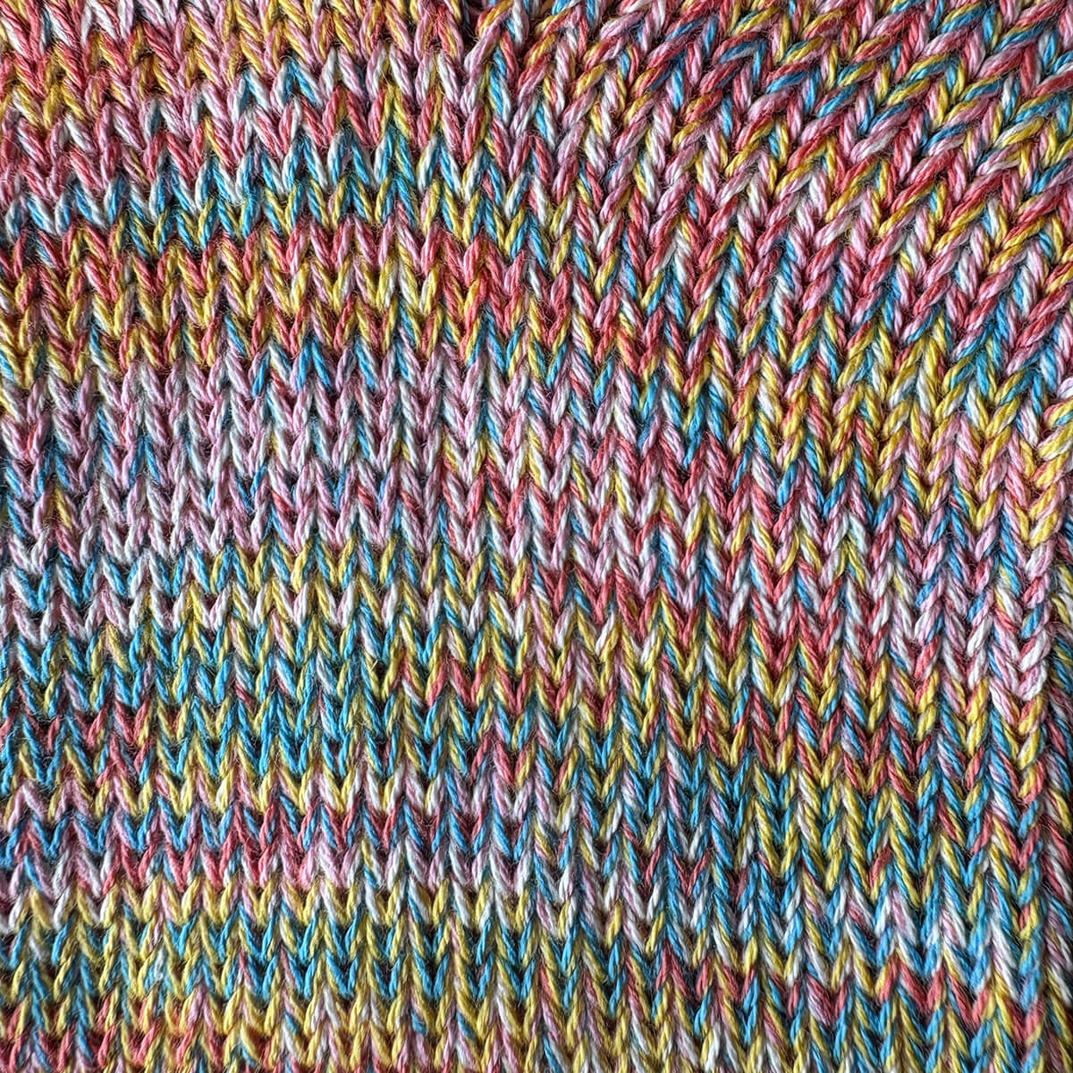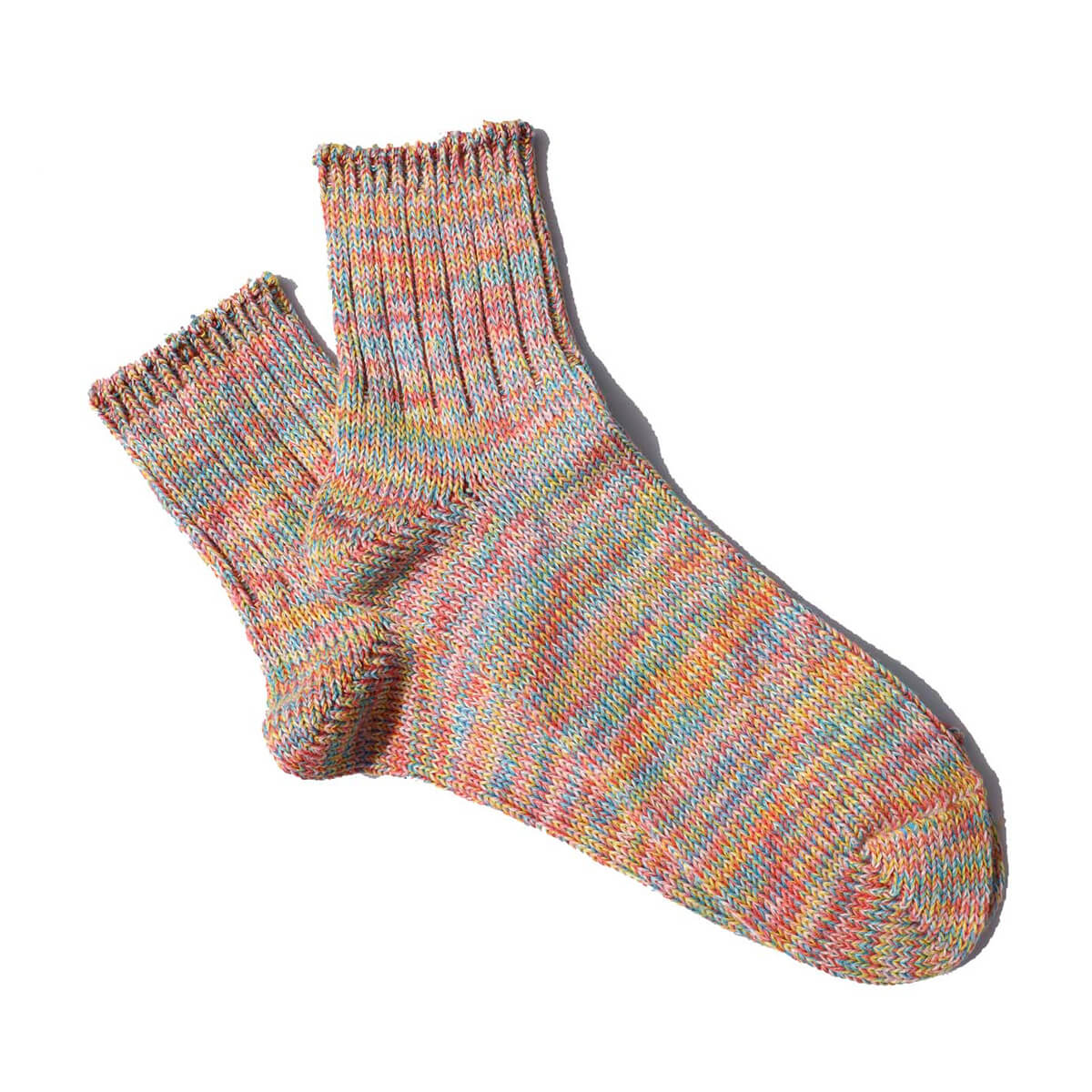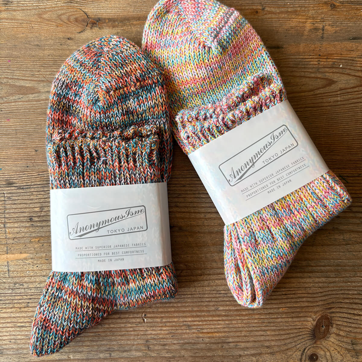 5 Colour Mix Quarter Adult Socks by Anonymous Ism. The 5 colour mix quarter sock is a medium-weight, chunky knit sock with a bouncy feel to the yarn and a supremely comfortable ribbed top. This is a signature piece from Anonymous Ism, blending craftsmanship with quality. The knitted fabric is carefully crafted using a unique over-gauge technique on low-gauge machines, achieving a perfect balance of softness, thickness, and durability. Made with vibrant, high-quality combed yarn, the socks reveal a rich, colourful pattern as the five hues intertwine beautifully, creating a distinctive and dynamic look. The quarter length sock is longer than an ankle sock but shorter than crew socks, typically extending above the ankle bone. This length makes them ideal for casual wear and warmer weather, providing the right amount of coverage without being too restrictive.