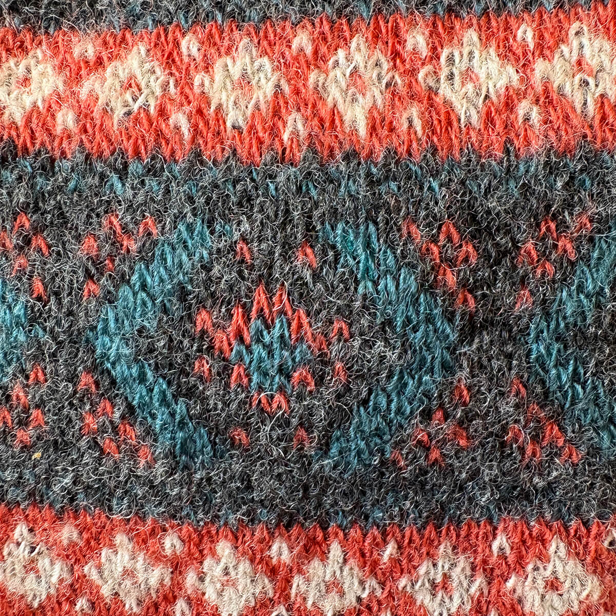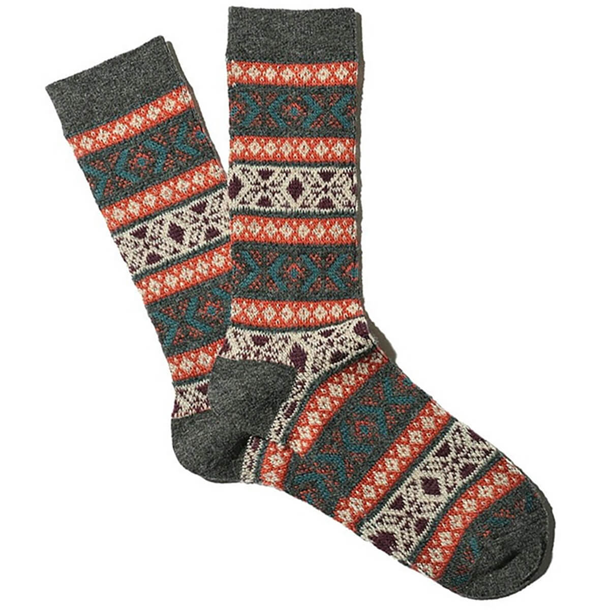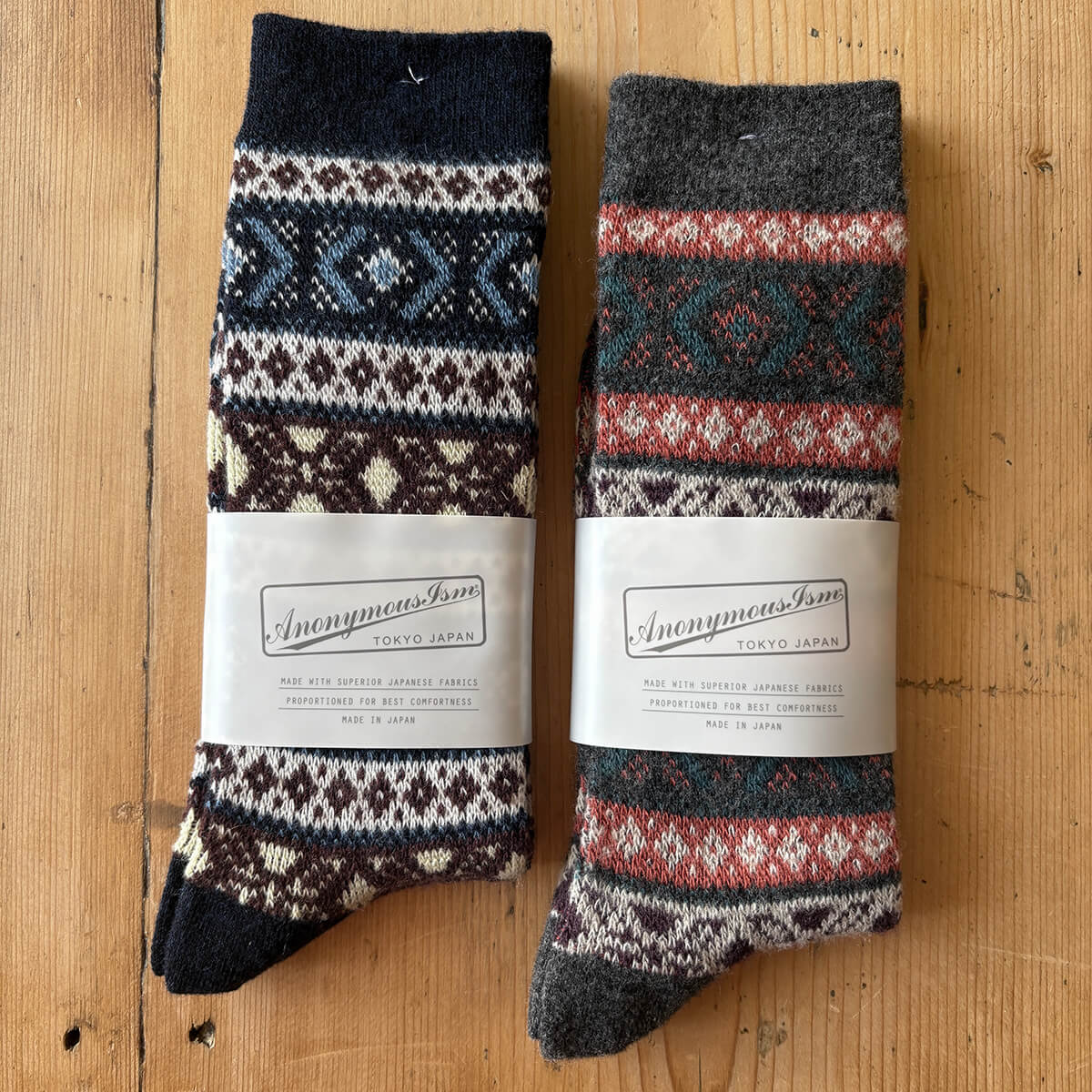Patterned Wool Jacquard Crew Adult Socks by Anonymous Ism. These jacquard knitted socks feature a distinctive woven pattern inspired by traditional winter fair isle designs, with a new and unique colour combination typical of Anonymous Ism. An essential for autumn and winter, they provide excellent stretch and comfort, with a high wool content to keep you warm without being too bulky.