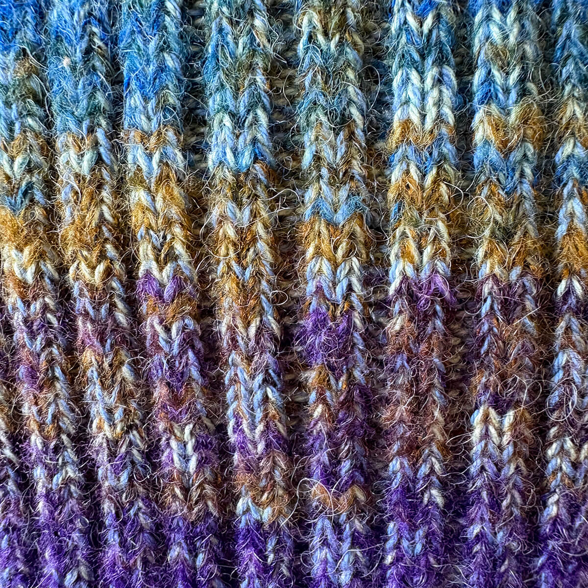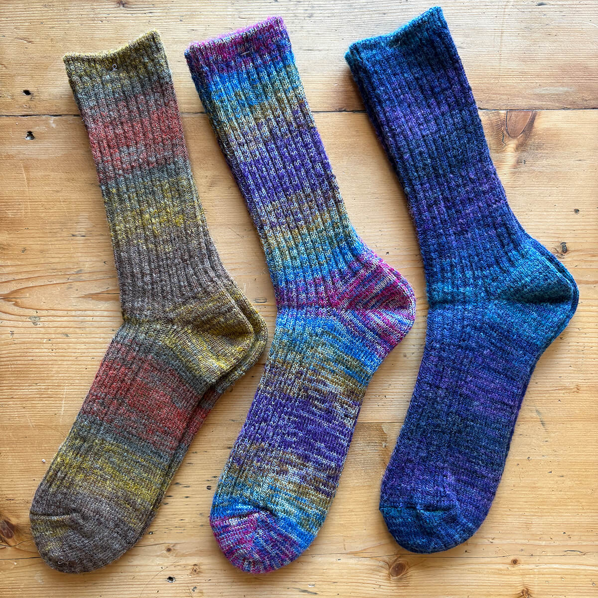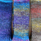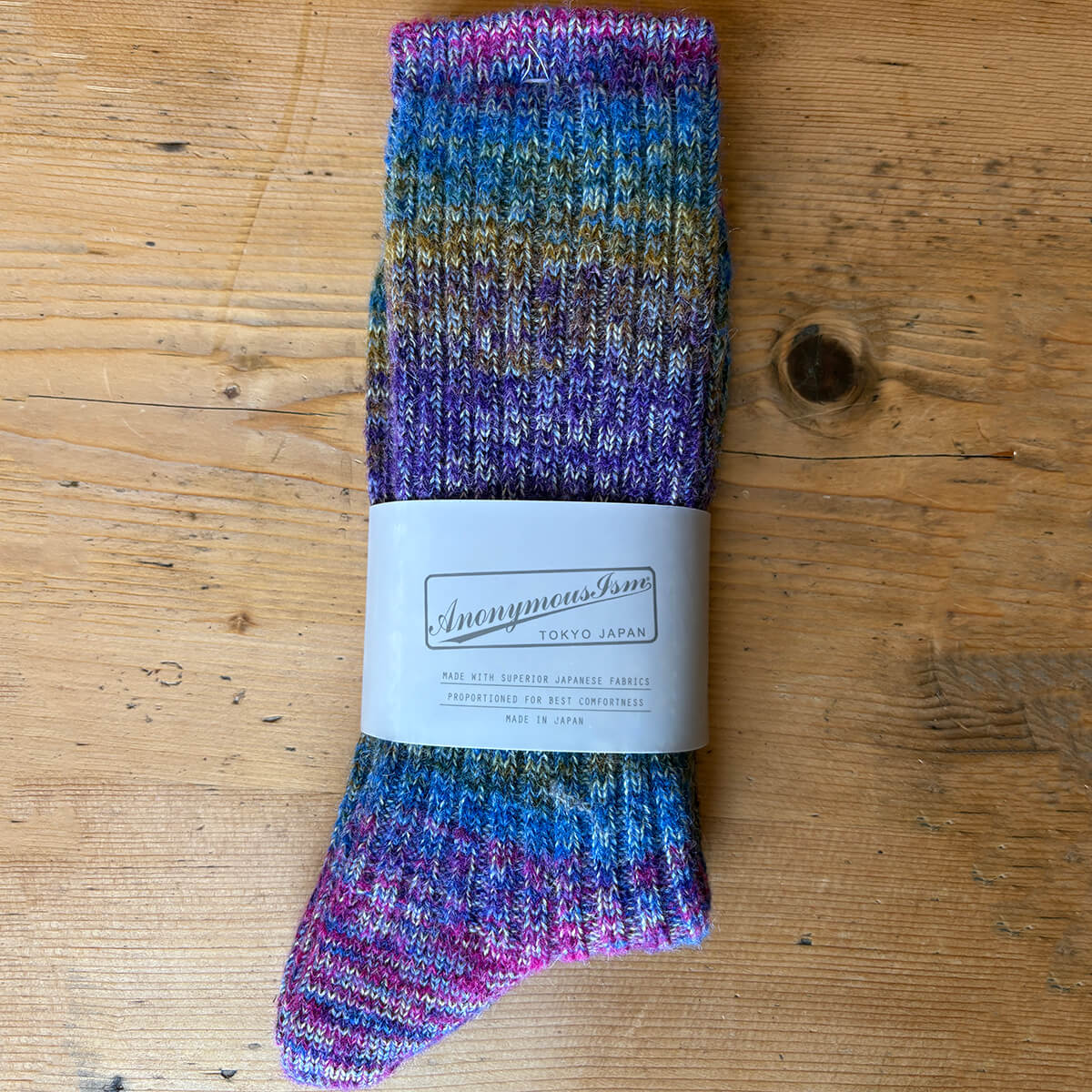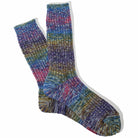 Splash Pattern Crew Adult Socks by Anonymous Ism. The splash pattern crew is a medium to heavier weight, rib knit chunky sock containing a blend of different yarns, including wool which is perfect for autumn and winter. This thicker, chunky knit sock has a sturdy feel to the yarn and a supremely comfortable ribbed top. The unique kasuri-dyed yarn creates an asymmetric design in vibrant colours, making each pair one-of-a-kind, like a tie-dye masterpiece. Enjoy the individuality of every sock!