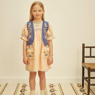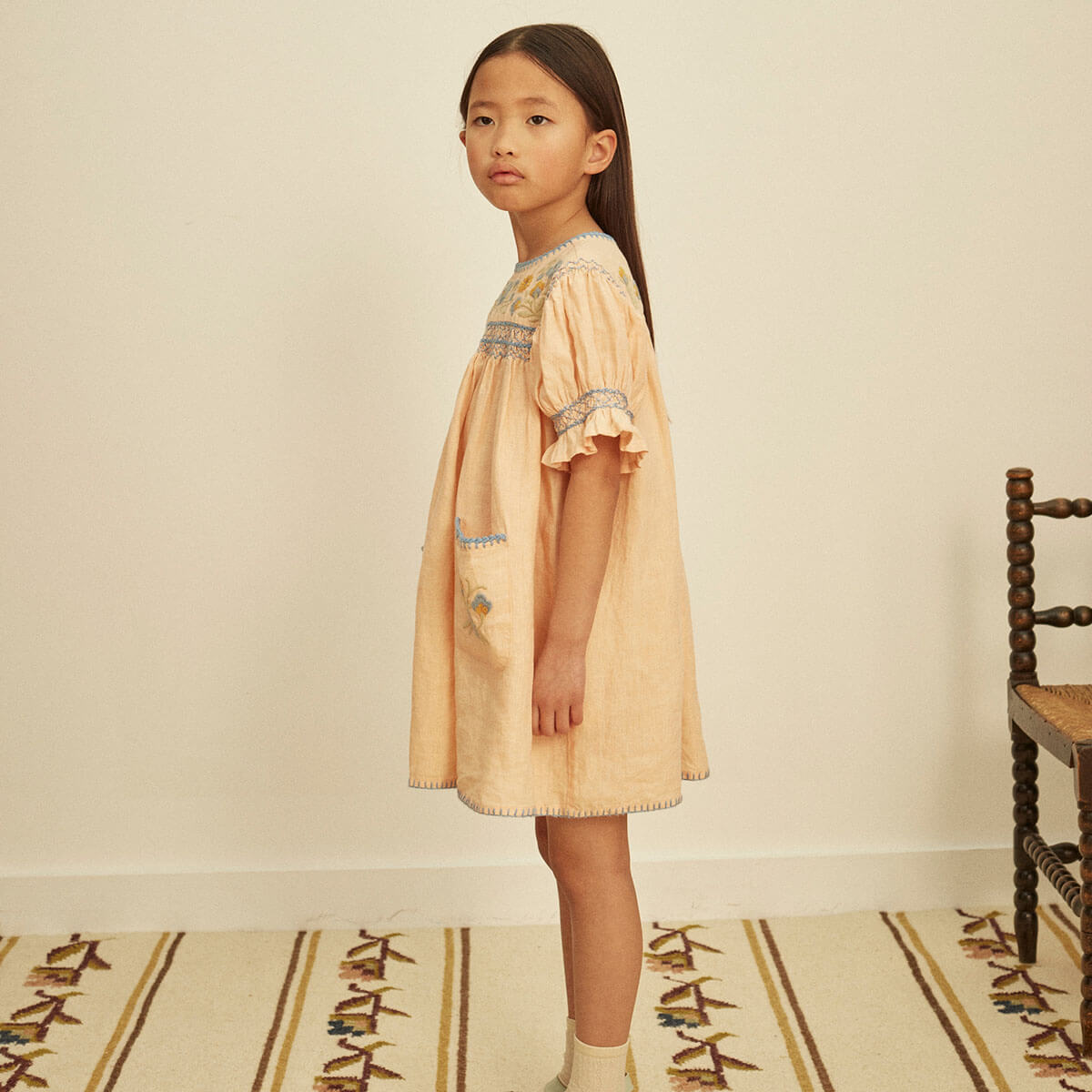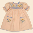 Dora Dress by Apolina. The delightful Dora dress comes in ‘satin pink’ linen. With classic yoke embroidery in the season’s pastel tones, contrast hand smocking at chest and puff sleeves, contrast crochet at neckline and pockets, and blanket stitch finish at hem. Invisible zip at closure at back. Dora is perfect worn with sandals for parties or summer days out.