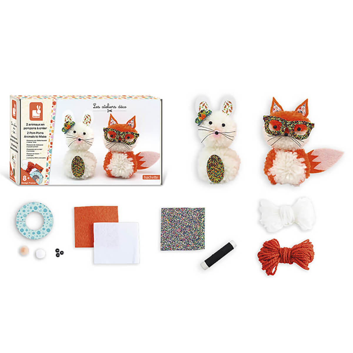 2 pom poms to make by Janod. Make two sweet fluffy pom pom pals with this craft kit. The box contains: 2 cardboard circles, 2 pieces of felt, 1 piece of glitter fabric, 2 pompoms, 6 black beads, 1 spool of black thread and 3 balls of thread.