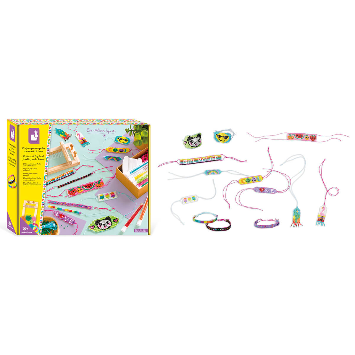 Bead and loom jewellery to make by Janod. This pretty craft kit will help children learn how to use a loom to make 13 seed bead jewellery pieces. The set contains 10 tubes of 500 different-coloured seed beads, white cotton thread, a loom, 2 needles and 2 coloured jade threads.