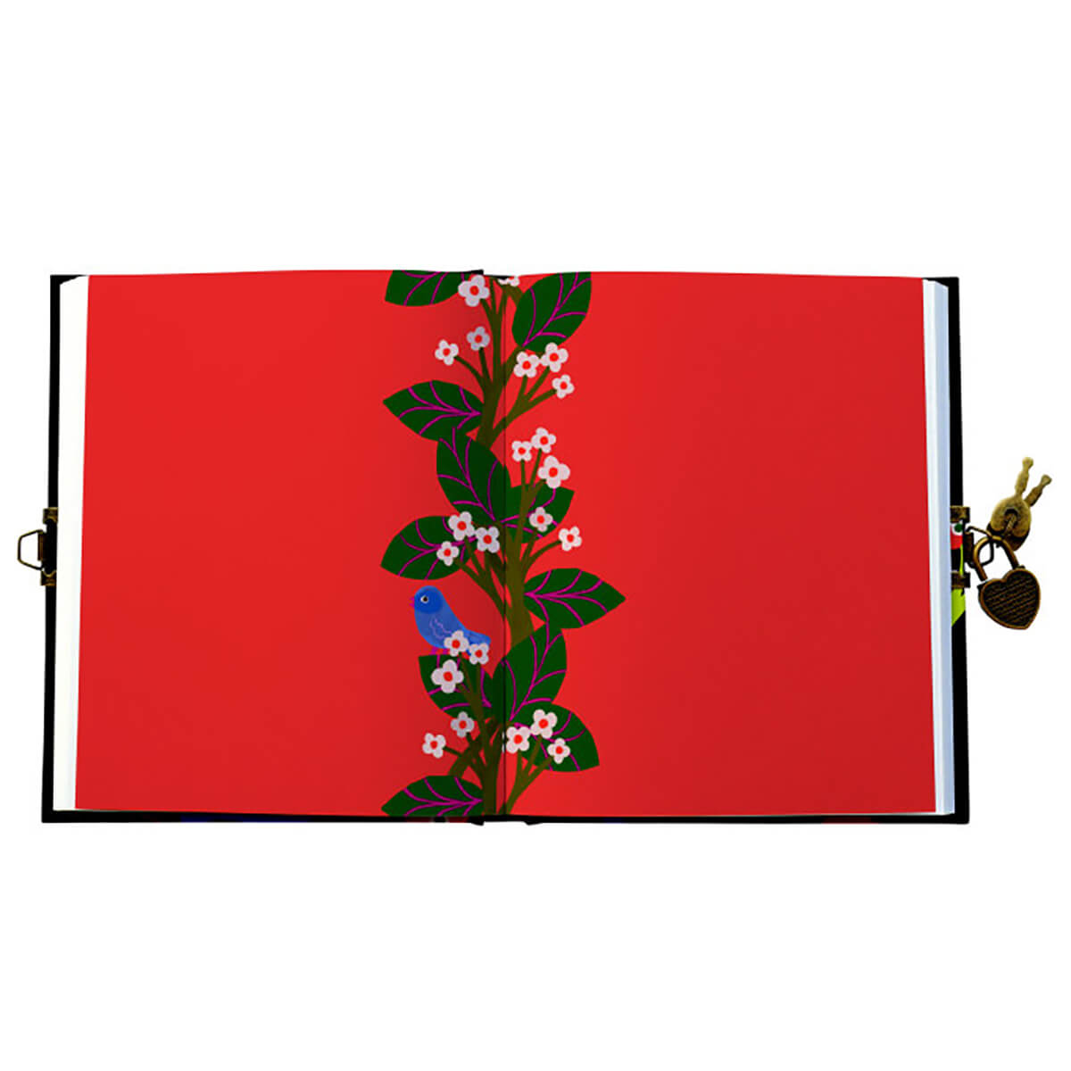 Birdsong Lockable Notebook by Roger La Borde. Stunning books for all your secrets, complete with heart-shaped padlock and keys! The lockable notebooks feature full-colour illustrated interiors, plus beautifully illustrated hard covers and printed endpapers. Every inch of these books is covered in colour… while leaving plenty of space for your thoughts.