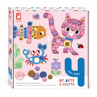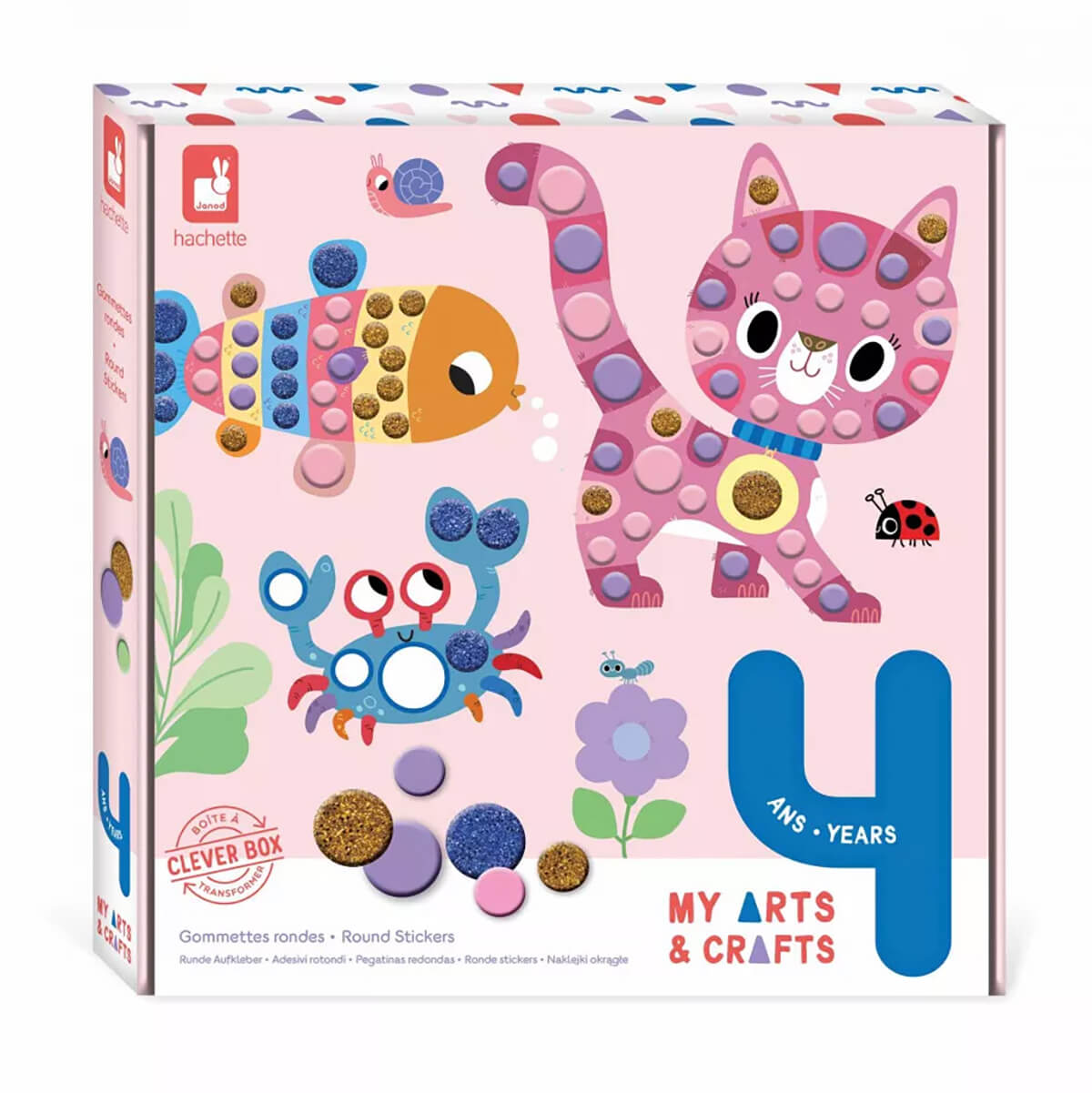 Creative Stickers Set by Janod. A set of 4 pictures to decorate with round stickers. This box is 3 boards of round classic foam stickers and 2 boards of round glittery foam stickers to decorate as desired.