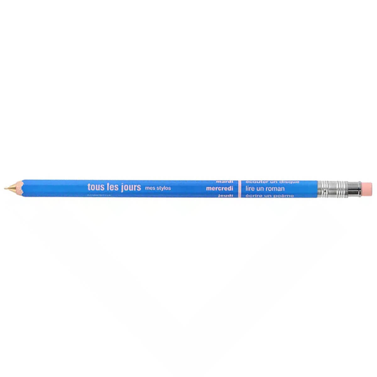 Days Mechanical Pencil With Eraser by Marks Inc. Super fine mechanical pencil with a hexagonal wooden body perfect for drawings, sketching and diagrams. The wooden casing of the Days mechanical pencil plays out the days of the week in French along with typical hobbies and events, such as reading a novel, taking a trip and watching a movie.