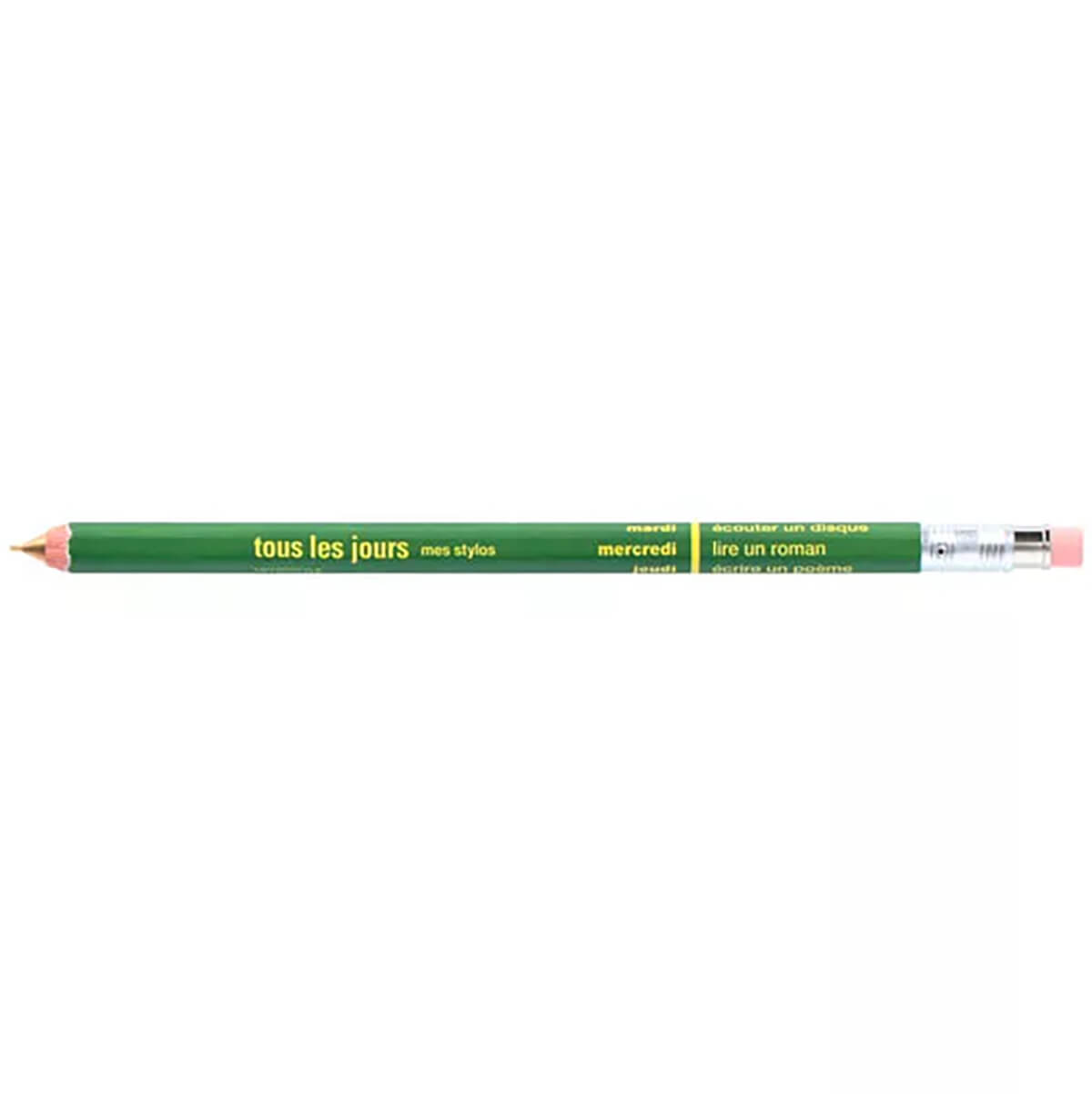 Days Mechanical Pencil With Eraser by Marks Inc. Super fine mechanical pencil with a hexagonal wooden body perfect for drawings, sketching and diagrams. The wooden casing of the Days mechanical pencil plays out the days of the week in French along with typical hobbies and events, such as reading a novel, taking a trip and watching a movie.