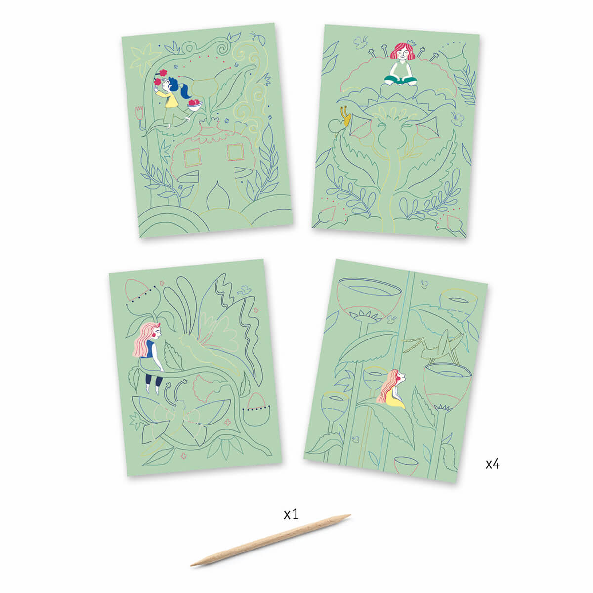 Fantasy Garden pastel scratch boards by Djeco. Four beautiful and intricate scratch pictures to reveal with a theme of Little Thumbelina in an original pastel coloured scratch material. Use the wooden scraper tool included to reveal a beautiful image underneath. Great creative fun for older kids, allowing them to produce beautiful images to treasure and display.