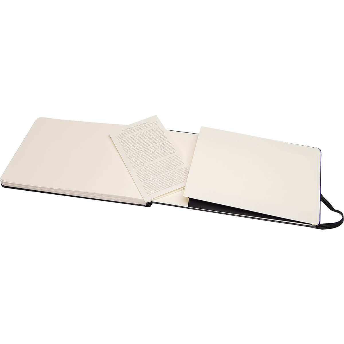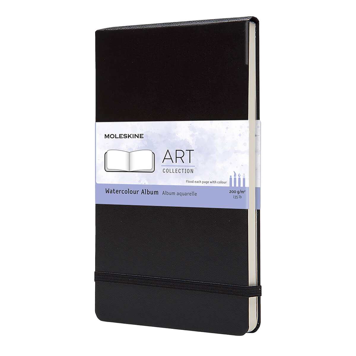 Large Watercolour Album in black by Moleskine. From Moleskine's Art Collection, this large watercolour album is bound in cardboard, with a classic 'moleskine' cover with rounded corners and an elastic enclosure. Each watercolour book has an expandable inner note holder made of cardboard and cloth. Features a special heavy paper for watercolour painting, 200 gsm with 25% cotton fiber, cold pressed, identical on both sides, and specially created for Moleskine.