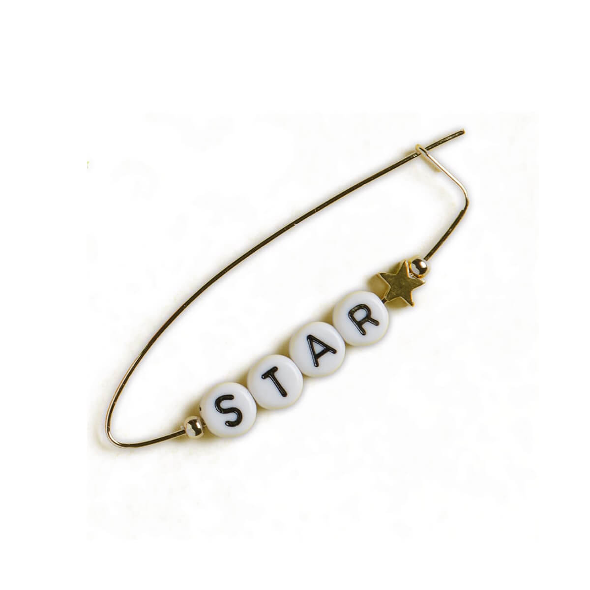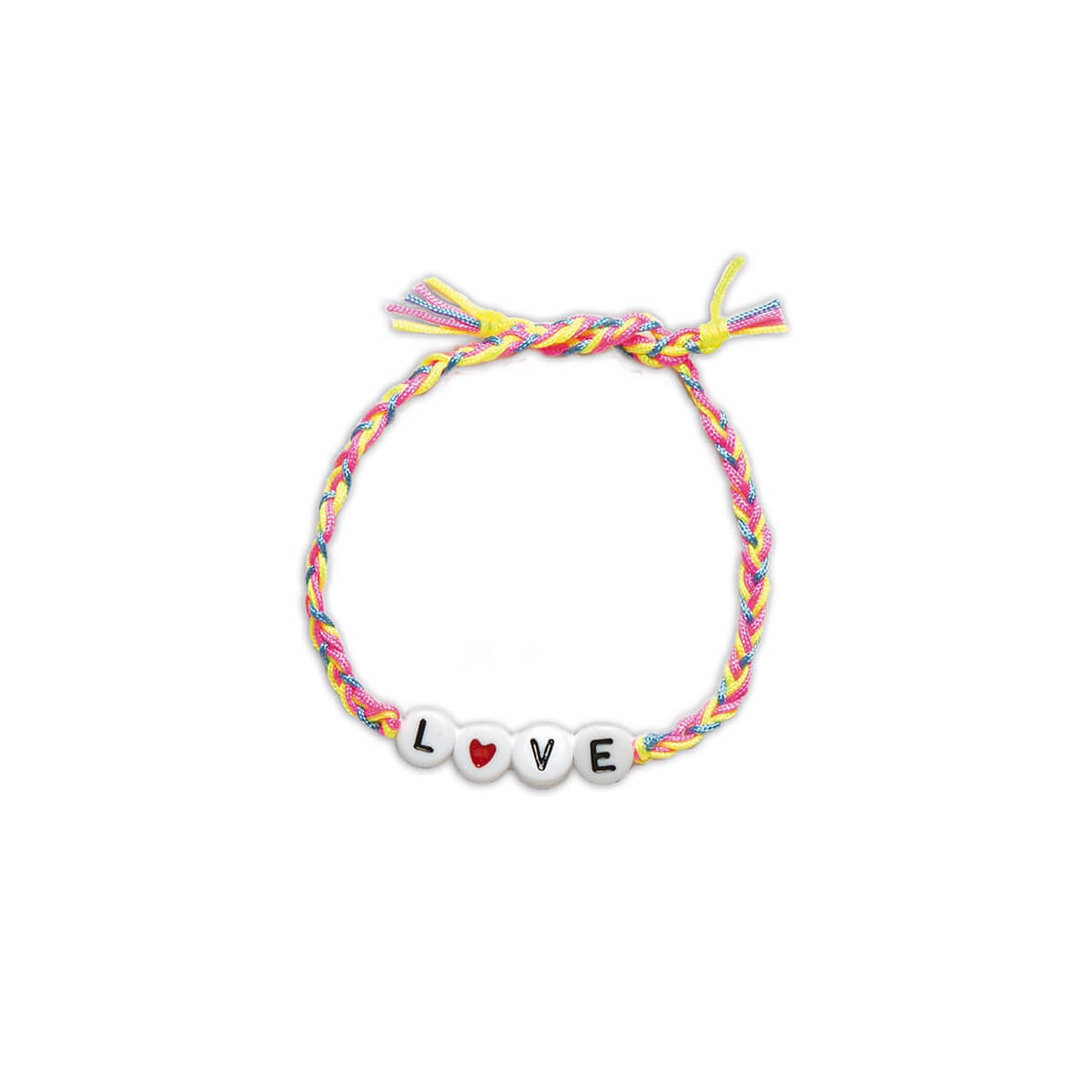 Kit contains 3 coloured threads, 1 nylon thread, 1 brooch, 2 charms (shell and star), 19 letter beads, 280 heishi beads in various colours, 5 gold beads, 2 rings (small and medium), 2 clasps and 1 instruction booklet.