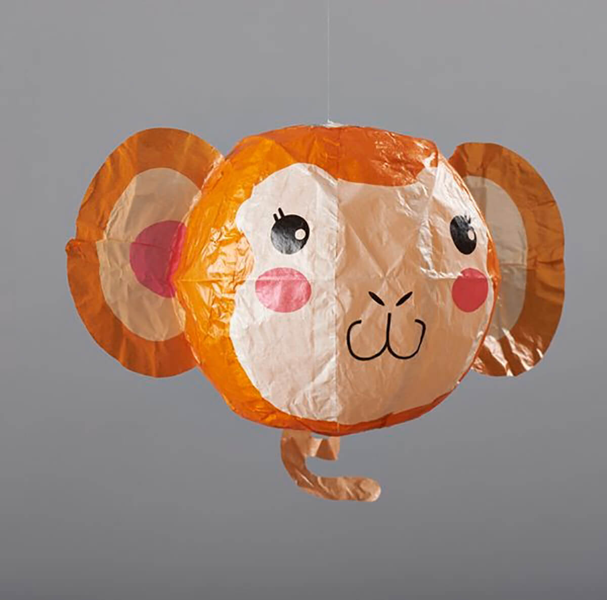 Monkey Japanese paper balloon by Petra Boase.  Each balloon comes flat, to use simply blow in the hole which will force the balloon to expand, inflate and form into its circular shape character.  The balloons can be flattened and blown up over and over again.