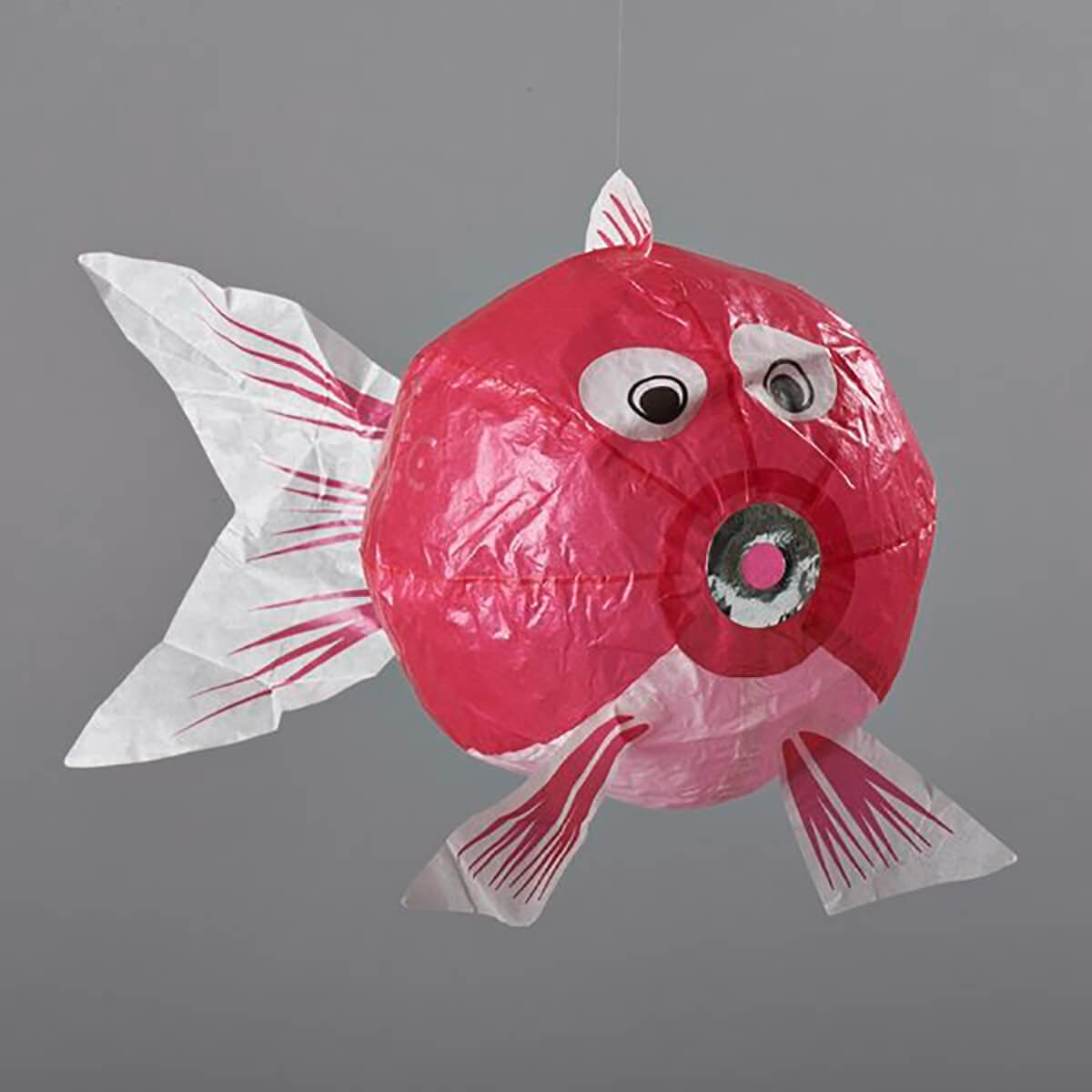 Pink fish Japanese paper balloon by Petra Boase.  Each balloon comes flat, to use simply blow in the hole which will force the balloon to expand, inflate and form into its circular shape character.  The balloons can be flattened and blown up over and over again.