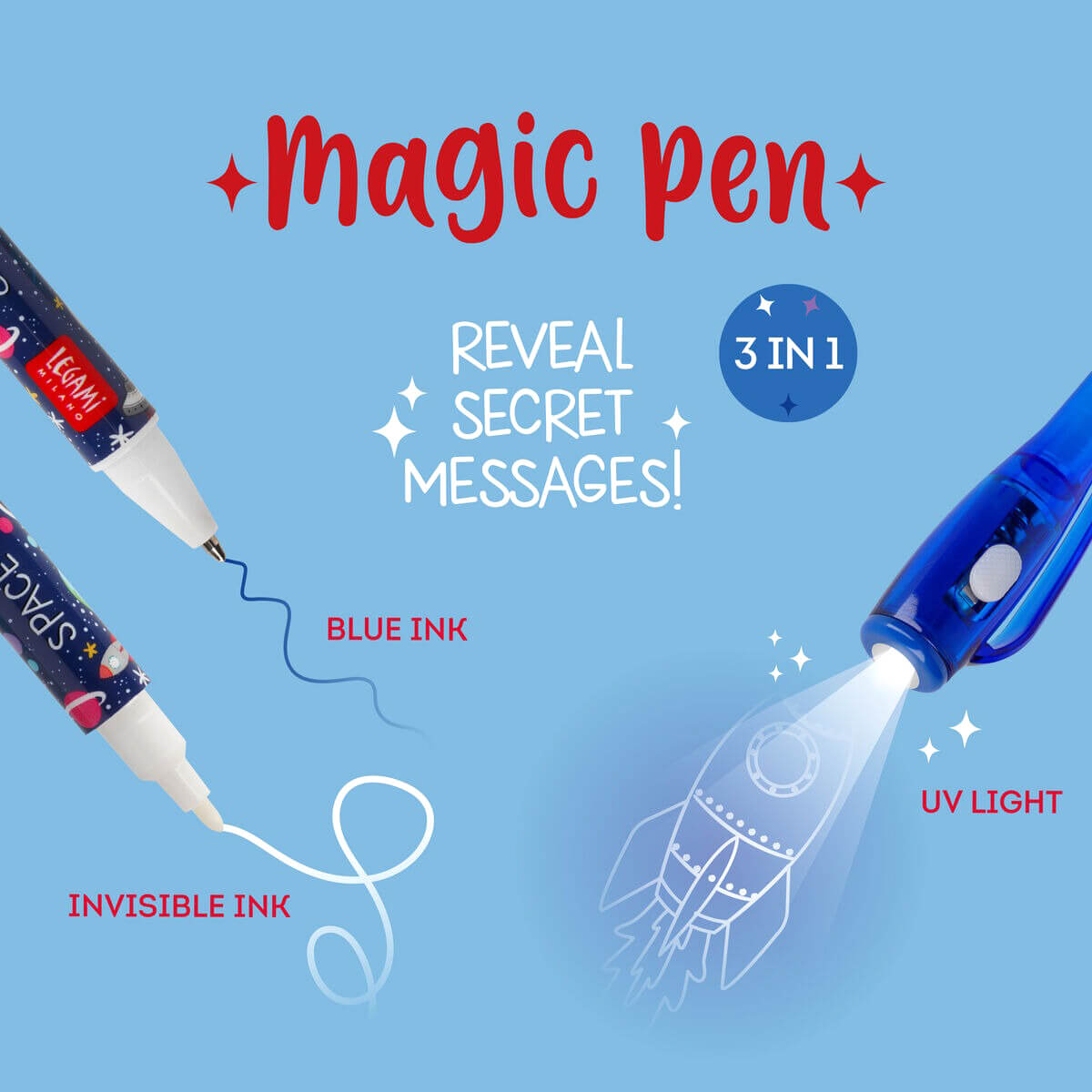 Space invisible ink magic pen by Legami. Hidden in plain sight - that’s the secret of this magic pen. Thanks to the dual tip, you can write in classic blue ink and then, in the blink of an eye, switch to spy mode with the invisible ink. Only by using the special UV light on the lid will what you’ve written become visible. Perfect for secret messages with your bestie and notes for class quizzes. Teacher won’t suspect a thing!