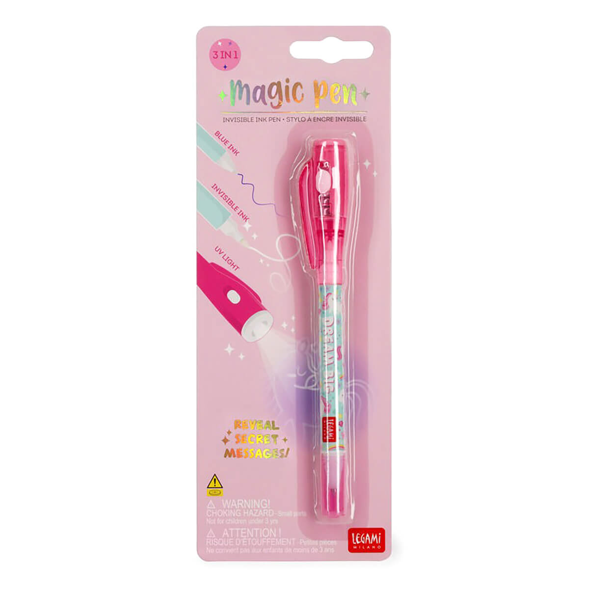 Unicorn invisible ink magic pen by Legami. Hidden in plain sight - that’s the secret of this magic pen. Thanks to the dual tip, you can write in classic blue ink and then, in the blink of an eye, switch to spy mode with the invisible ink. Only by using the special UV light on the lid will what you’ve written become visible. Perfect for secret messages with your bestie and notes for class quizzes. Teacher won’t suspect a thing!