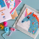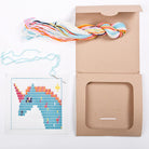 Unicorn picture frame needlepoint kit by Sozo. These Sozo kits are an easy and fun introduction to needlepoint, available in a variety of designs for girls and boys. The design is printed on heavy, short stitch fabric net, removing the need for an embroidery hoop and making the kit easier for younger children. The eco-friendly packaging sleeve is made of recycled paper and is designed to be easily turned into a box frame perfect for displaying your creation.