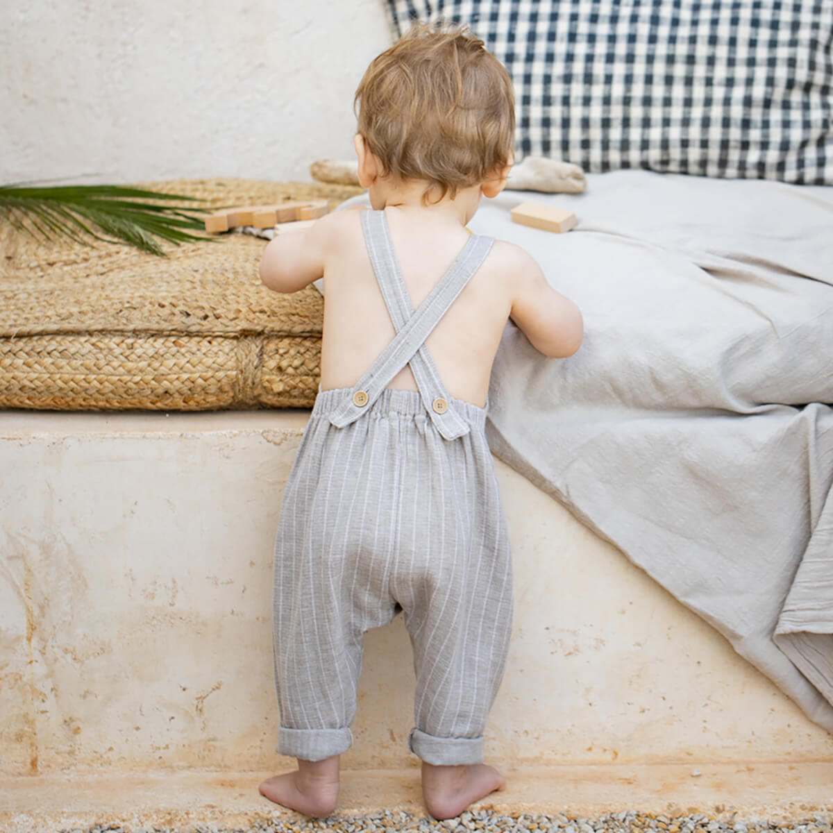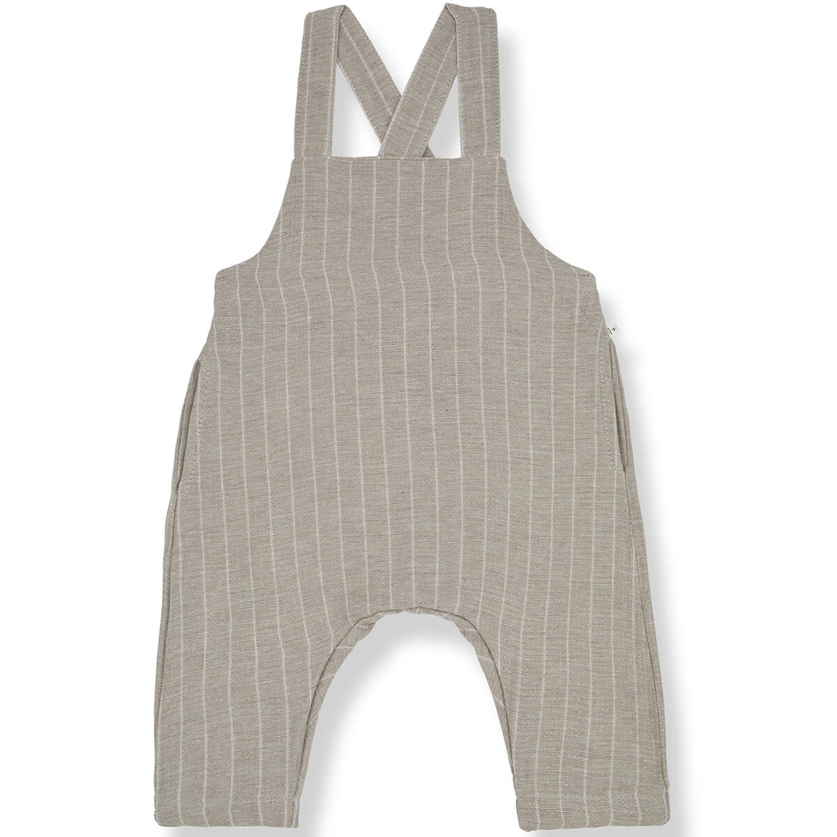 Ettore Overall by 1+ in the Family. Sweet baby dungarees in a diplomatic stripes double face fabric. With wooden button fastenings.