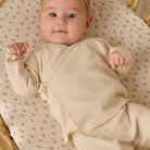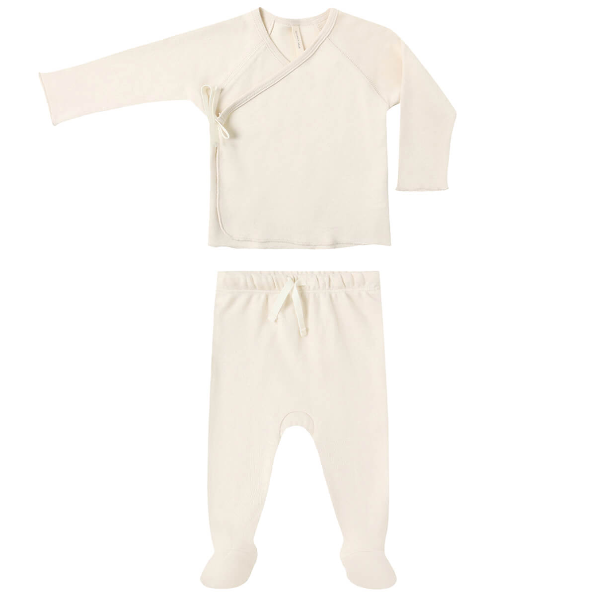 Wrap Top and Footed Pant Set by Quincy Mae. A long sleeve wrap top + footed pant set crafted from organic brushed jersey that ties on the outside for a comfortable fit, with matching footed drawstring pants.