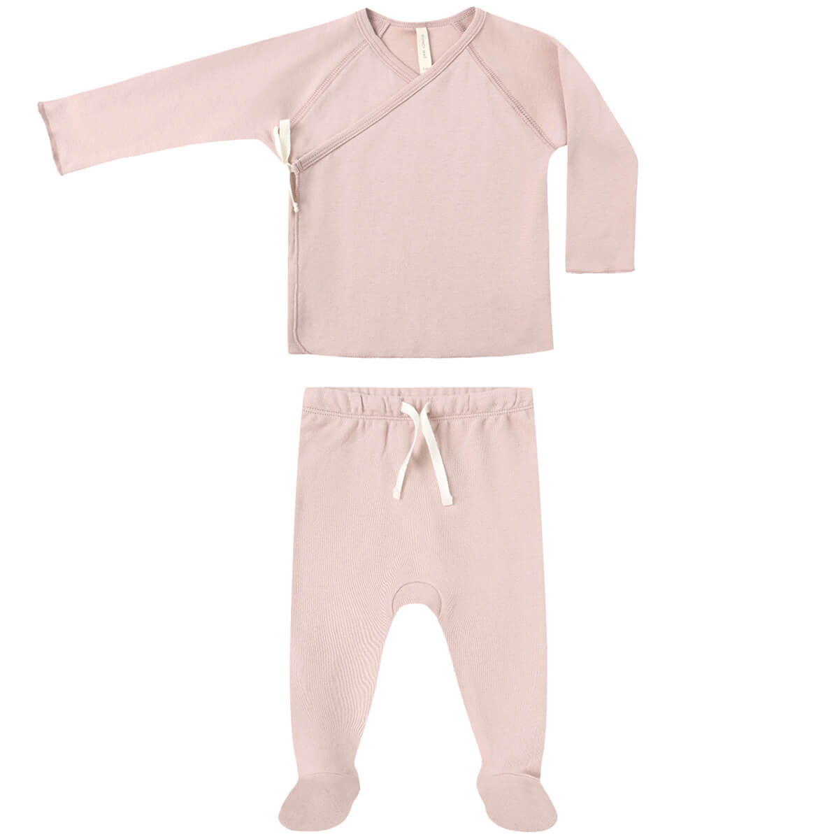 Wrap Top and Footed Pant Set by Quincy Mae. A long sleeve wrap top + footed pant set crafted from organic brushed jersey that ties on the outside for a comfortable fit, with matching footed drawstring pants.