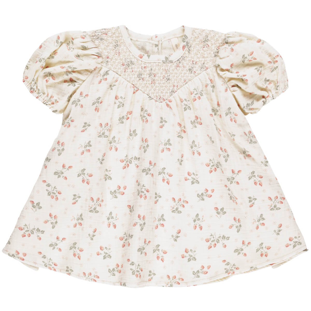 Carina Dress by Quincy Mae. Babydoll dress with sweet bubble sleeves and beautiful diamond smocking around the neckline. Designed with buttons at the back for easy changes. Coordinating bloomers included with all sizes.