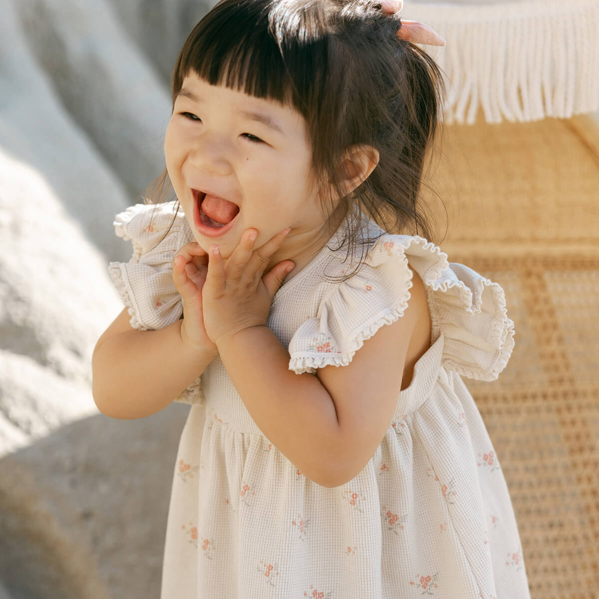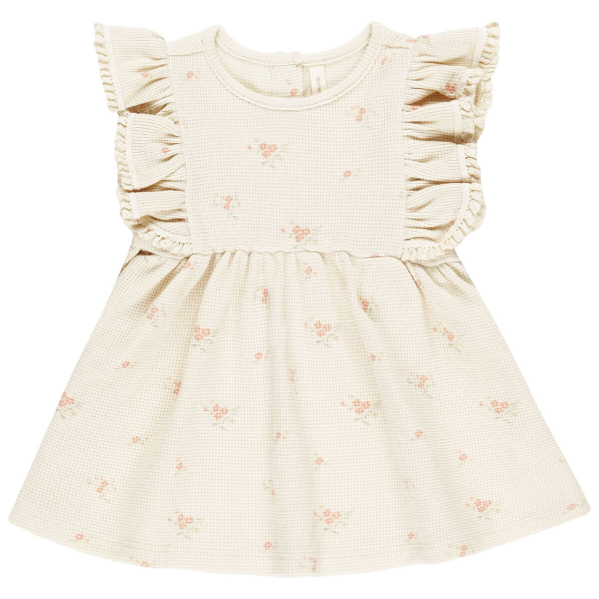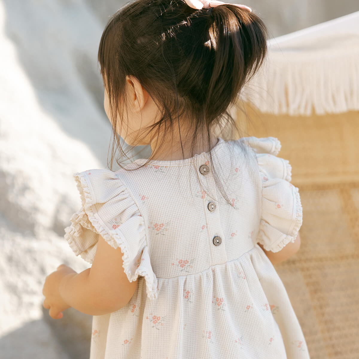 Daisy Dress by Quincy Mae. Ruffle sleeve babydoll dress made from soft and breathable waffle knit cotton. Designed with back buttons for easy changes, and the sweetest crochet lace ruffle detail. Coordinating bloomers included with all sizes.