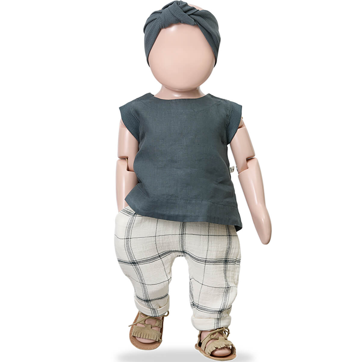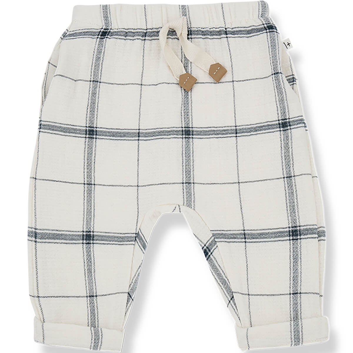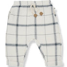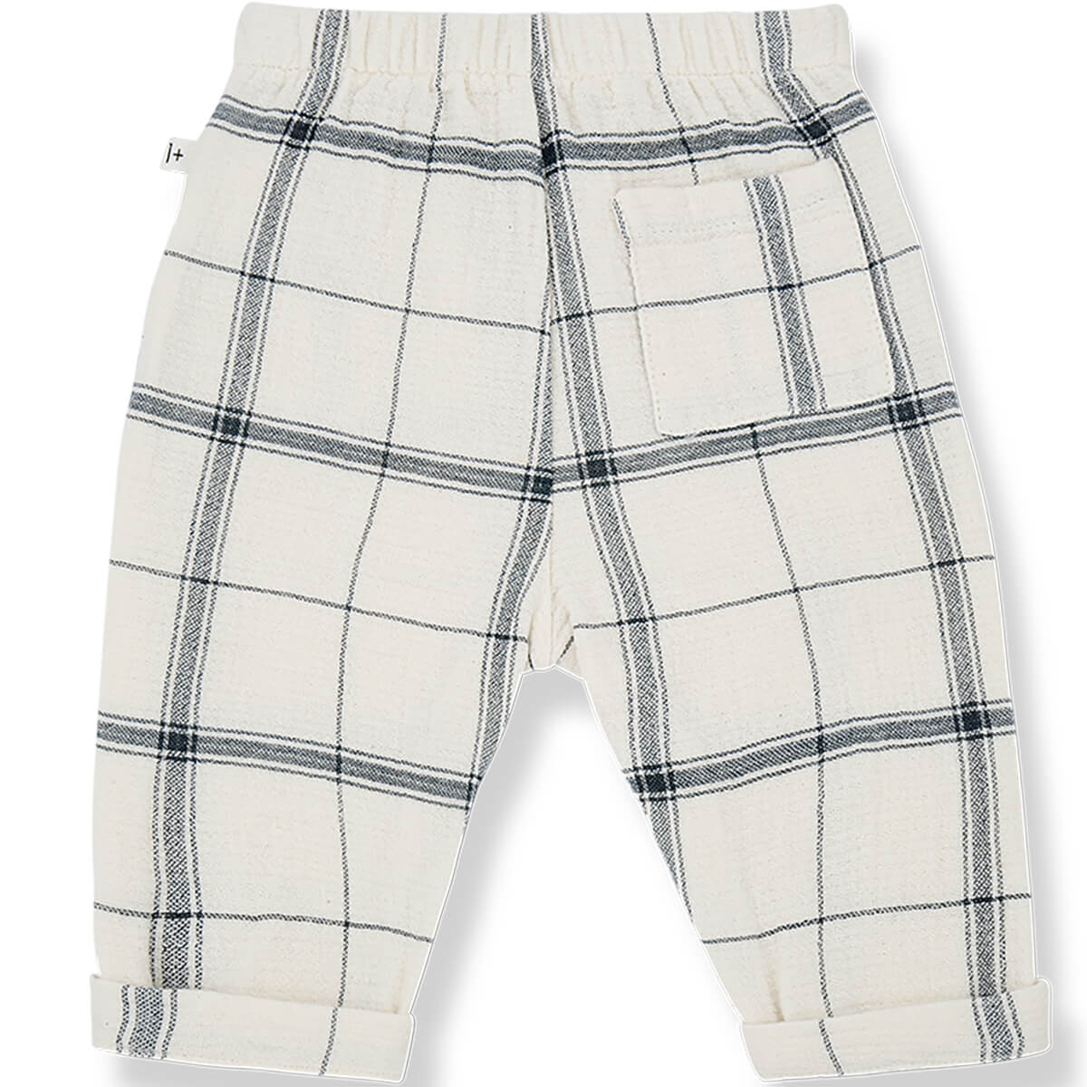 Icaro Pants by 1+ in the Family. Soft baby trousers in a checked double face fabric. With drawstring waist, ankle cuffs and pockets.
