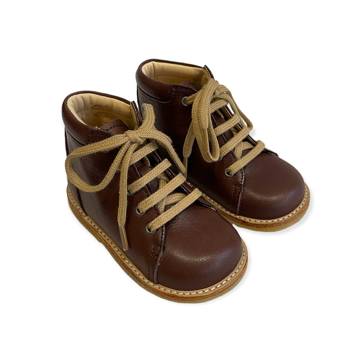 Lace up starter boots by Angulus. Leather lace up boots with stitching detail, ideal as first walkers as they provide very good ankle support, with a soft and flexible crepe rubber sole. Lined with 100% chrome-free leather.