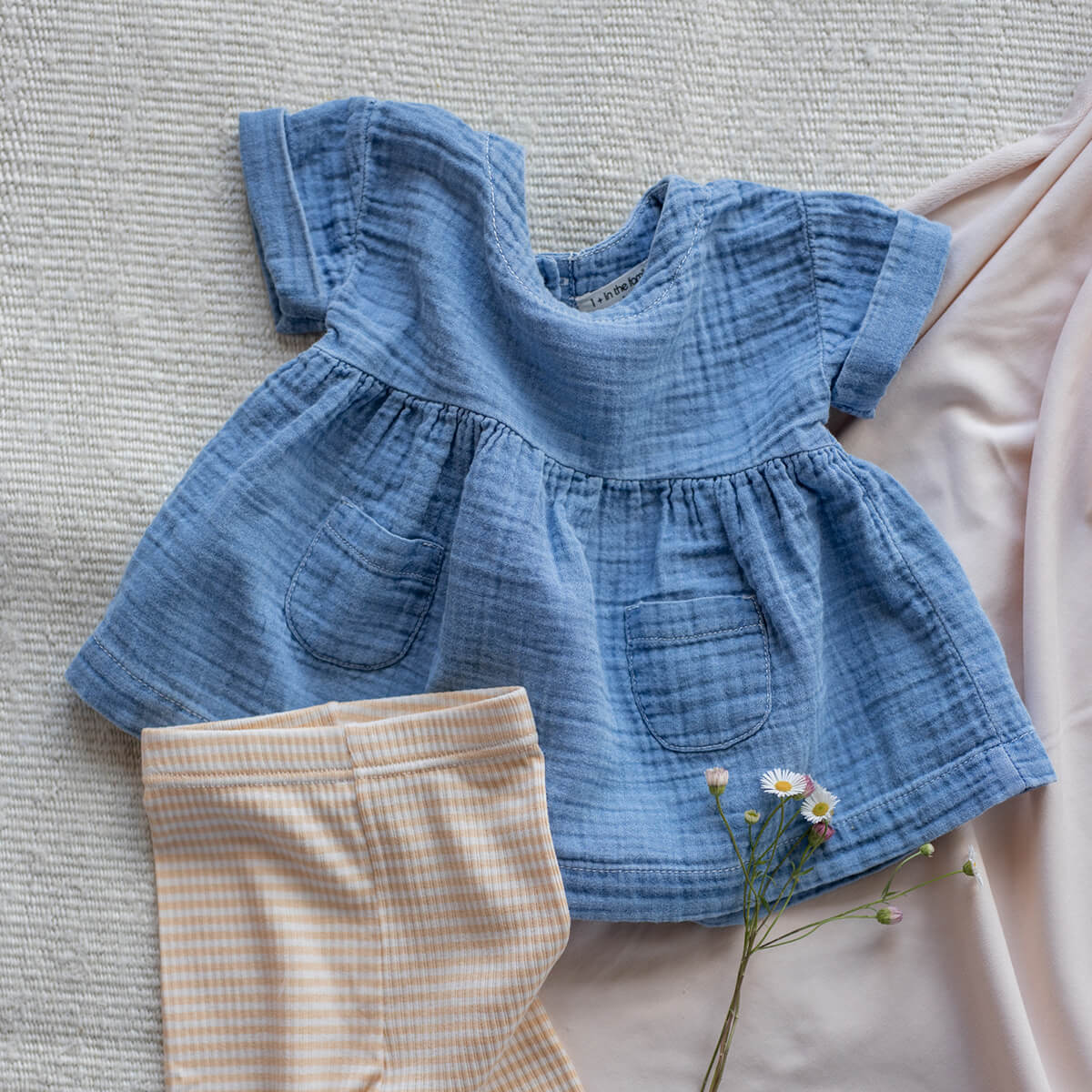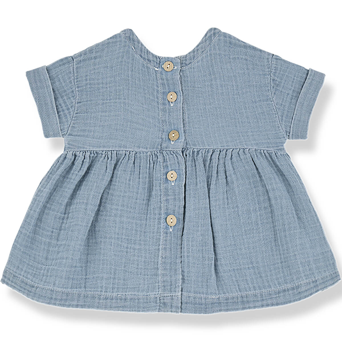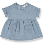 Lavinia Dress by 1+ in the Family. Short-sleeve pocket front dress in a soft washed chambray fabric with wooden buttons.