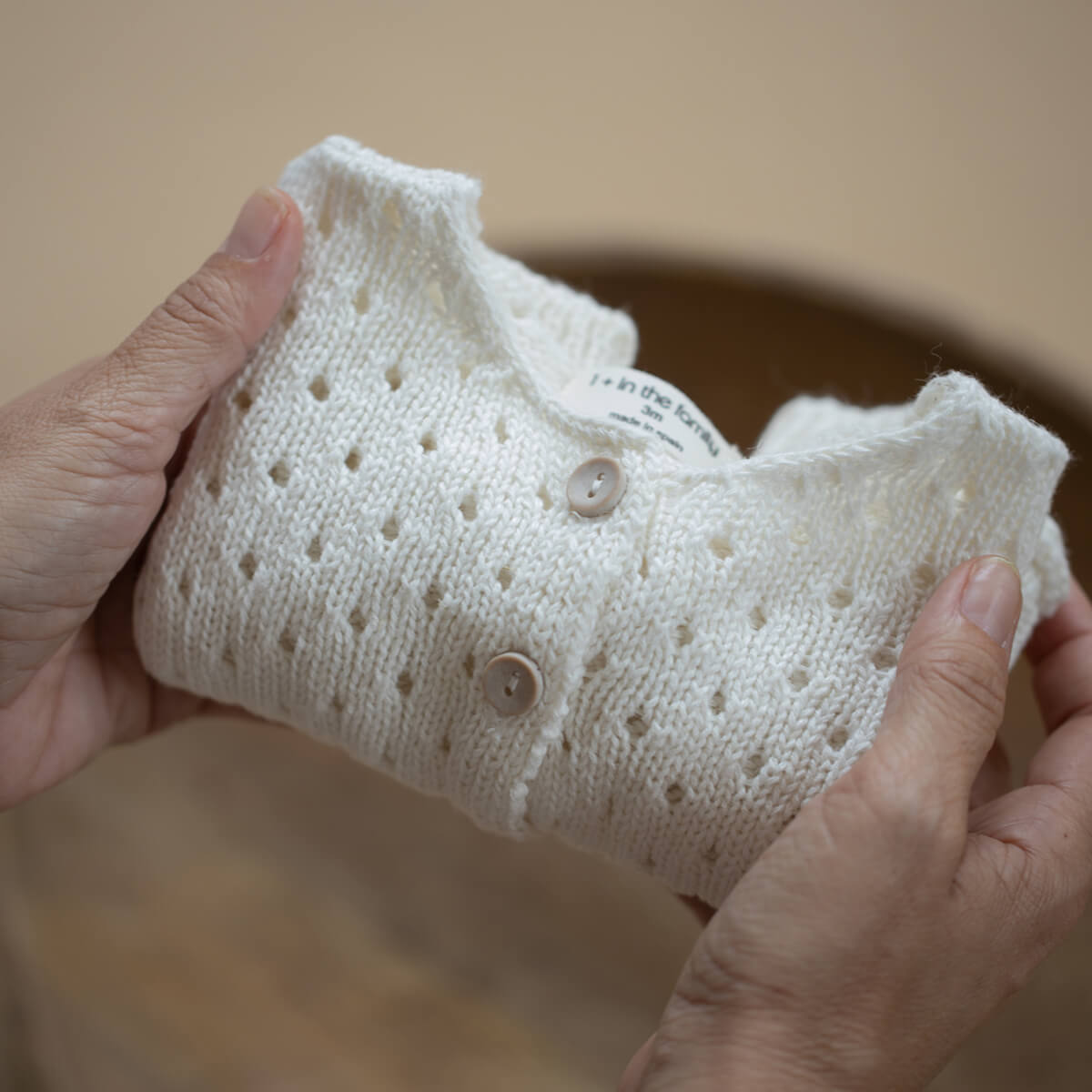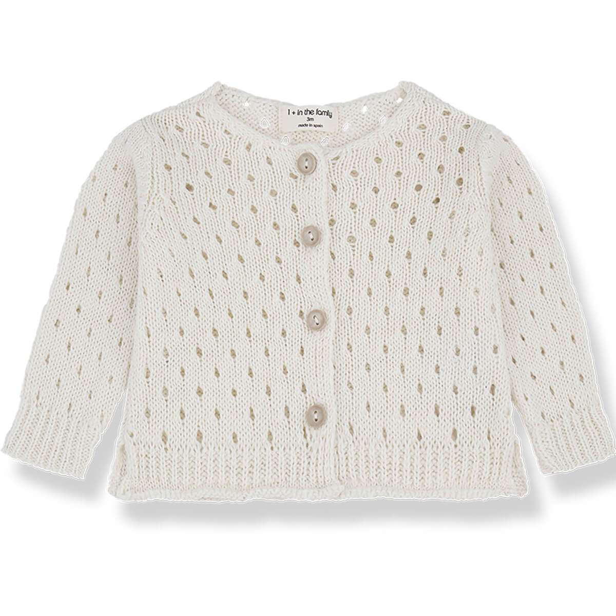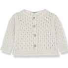 Telma Cardigan by 1+ in the Family. A soft knit baby cardigan in a cool linen blend with wooden buttons.