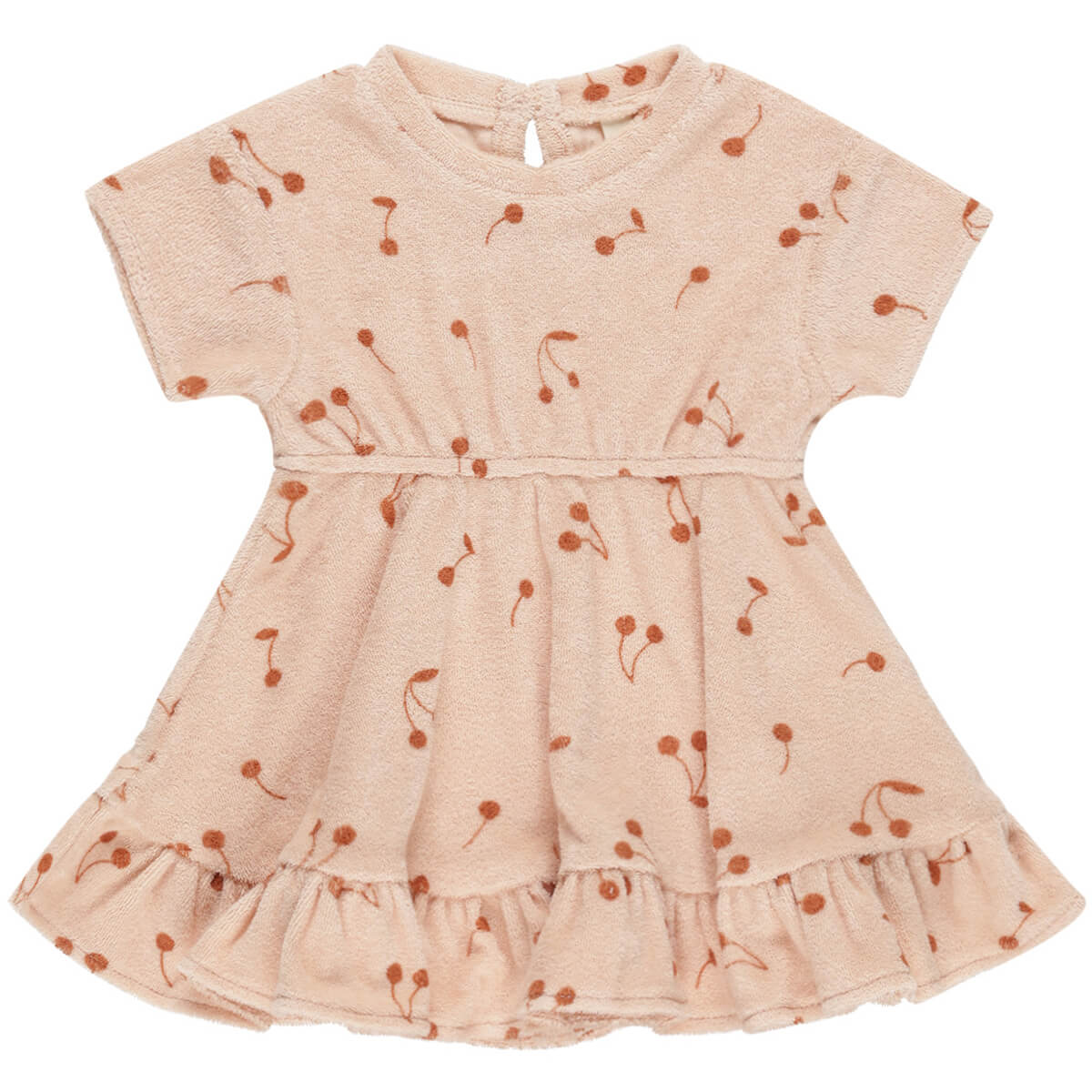 Terry Dress by Quincy Mae. This sweet dress made of terry cloth fabric features ruffle trim, an elasticised waist, and a button keyhole closure for the perfect fit. Coordinating bloomers included with all sizes.