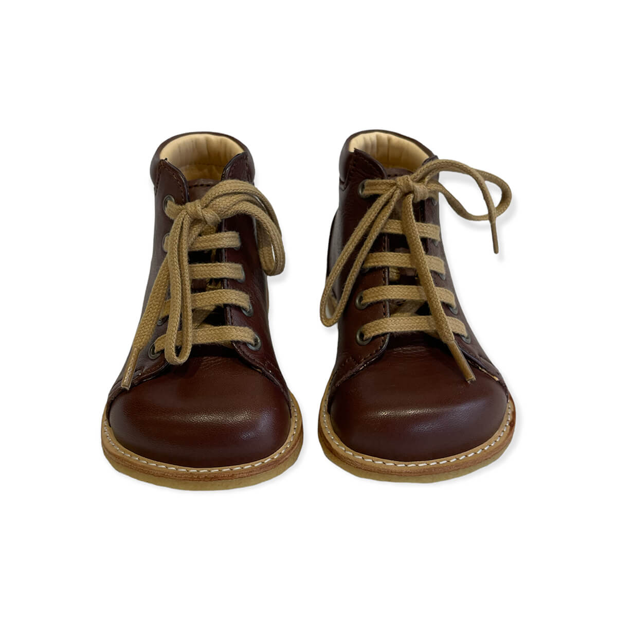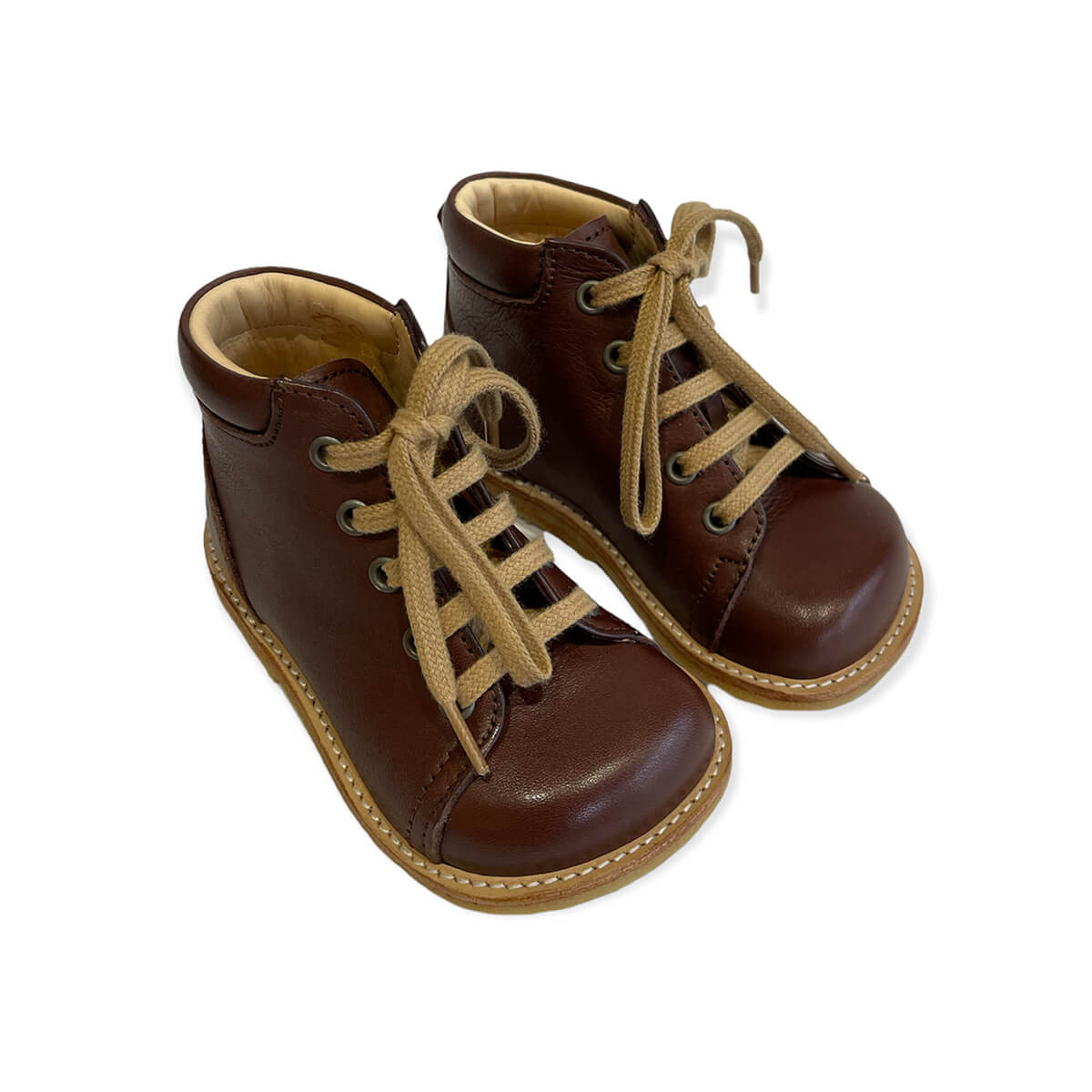 Lace up starter boots in a wider fitting by Angulus. Leather lace up boots with stitching detail, ideal as first walkers as they provide very good ankle support, with a soft and flexible crepe rubber sole. Lined with 100% chrome-free leather.