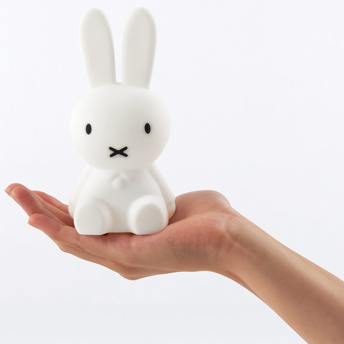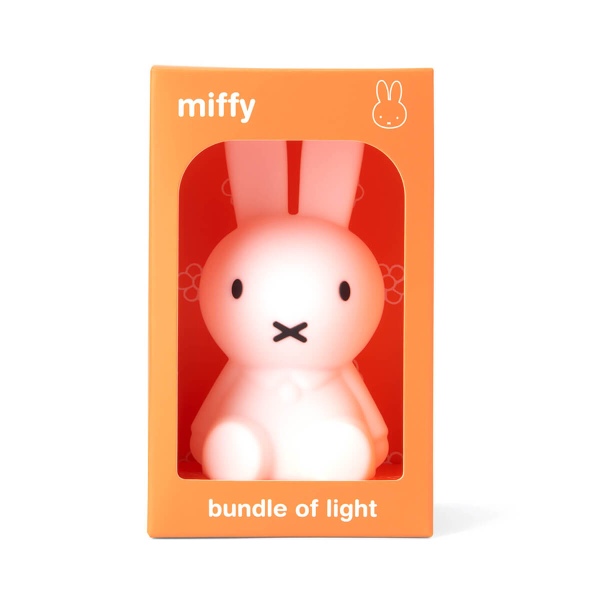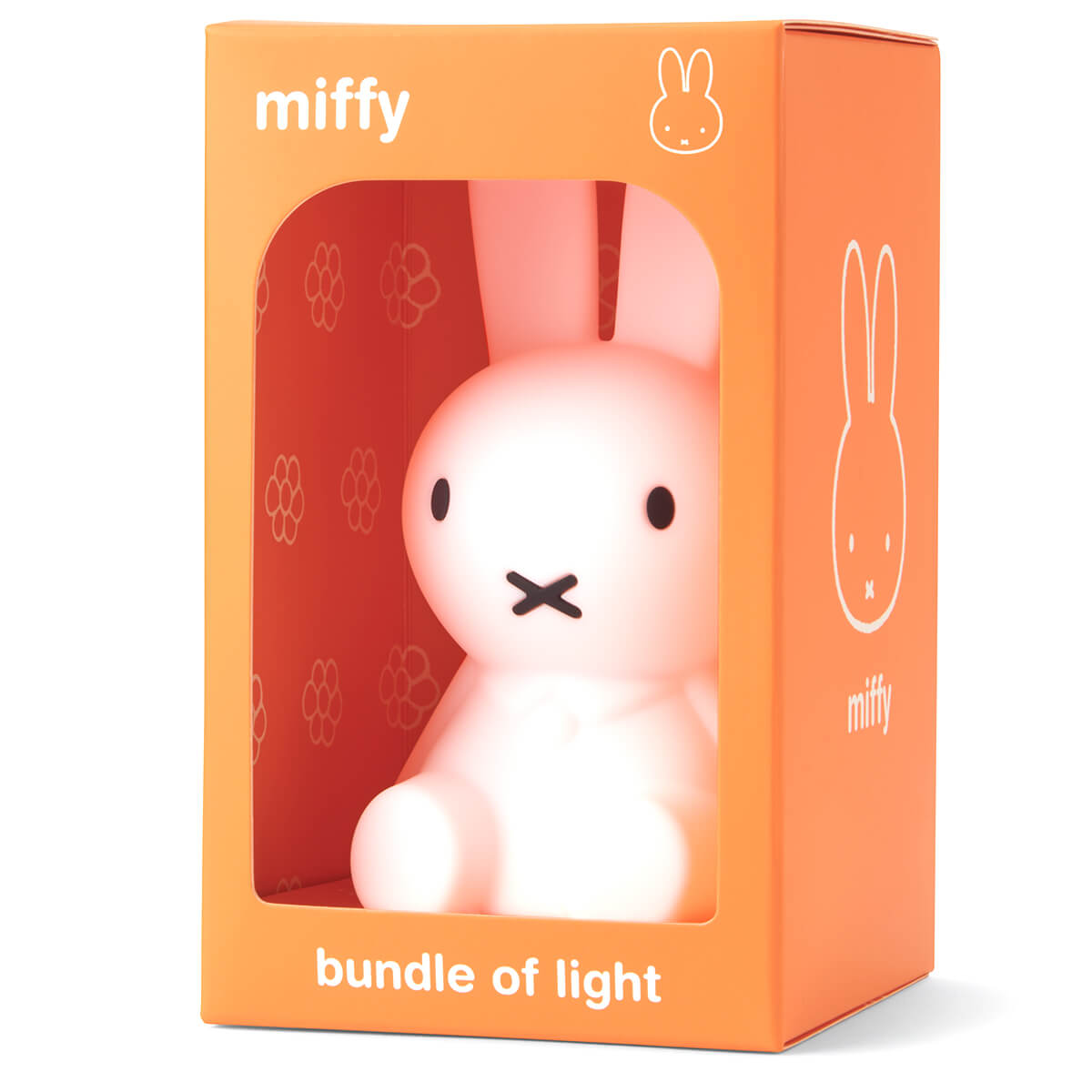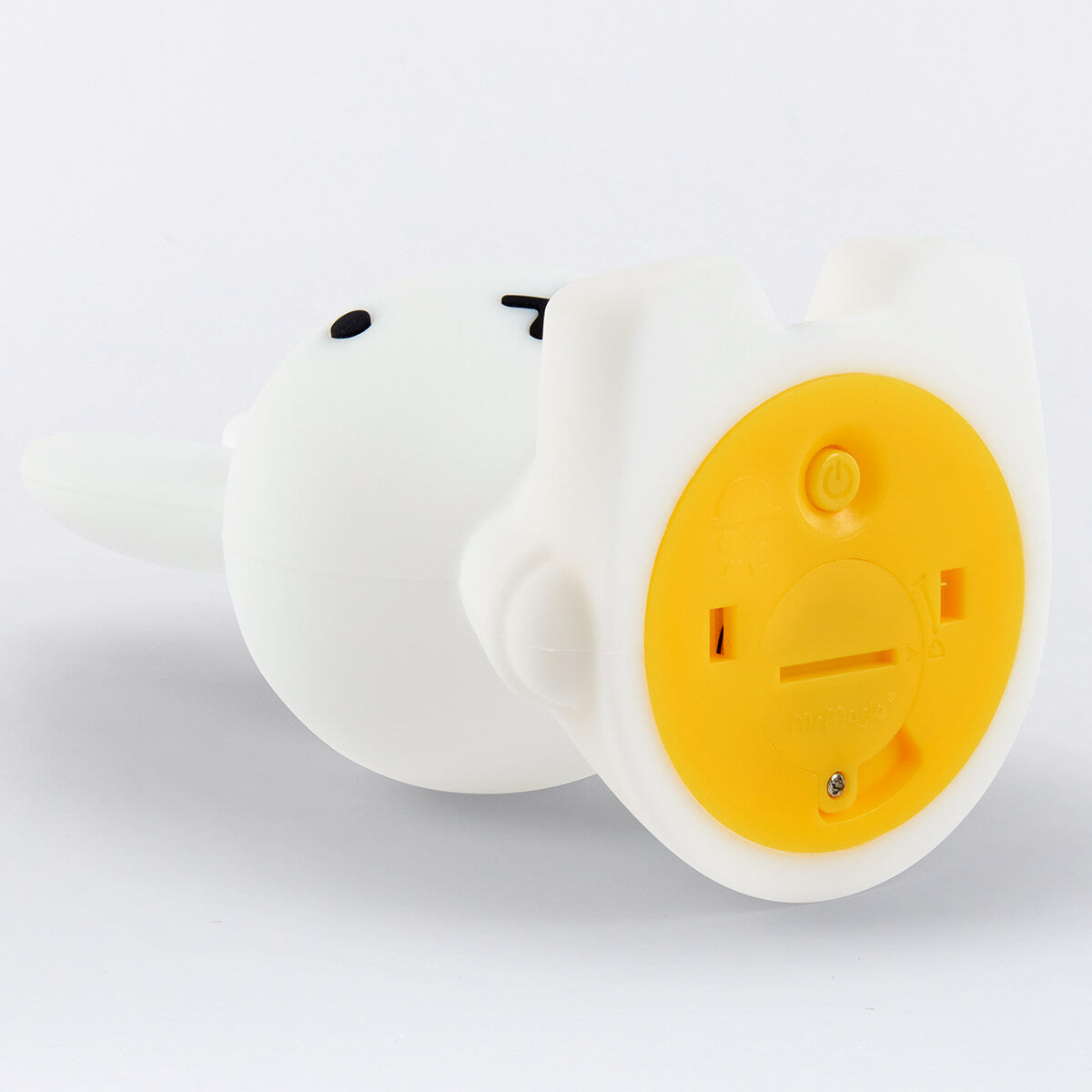 Miffy bundle of light by Mr. Maria. A sweet little portable mini-light made from soft silicone with a LED lamp powered by a CR2032 cell battery. Light switch on the bottom, with a 15 minute timer for long lasting use. The battery will power the LED up to 30 hours (120 cycles).