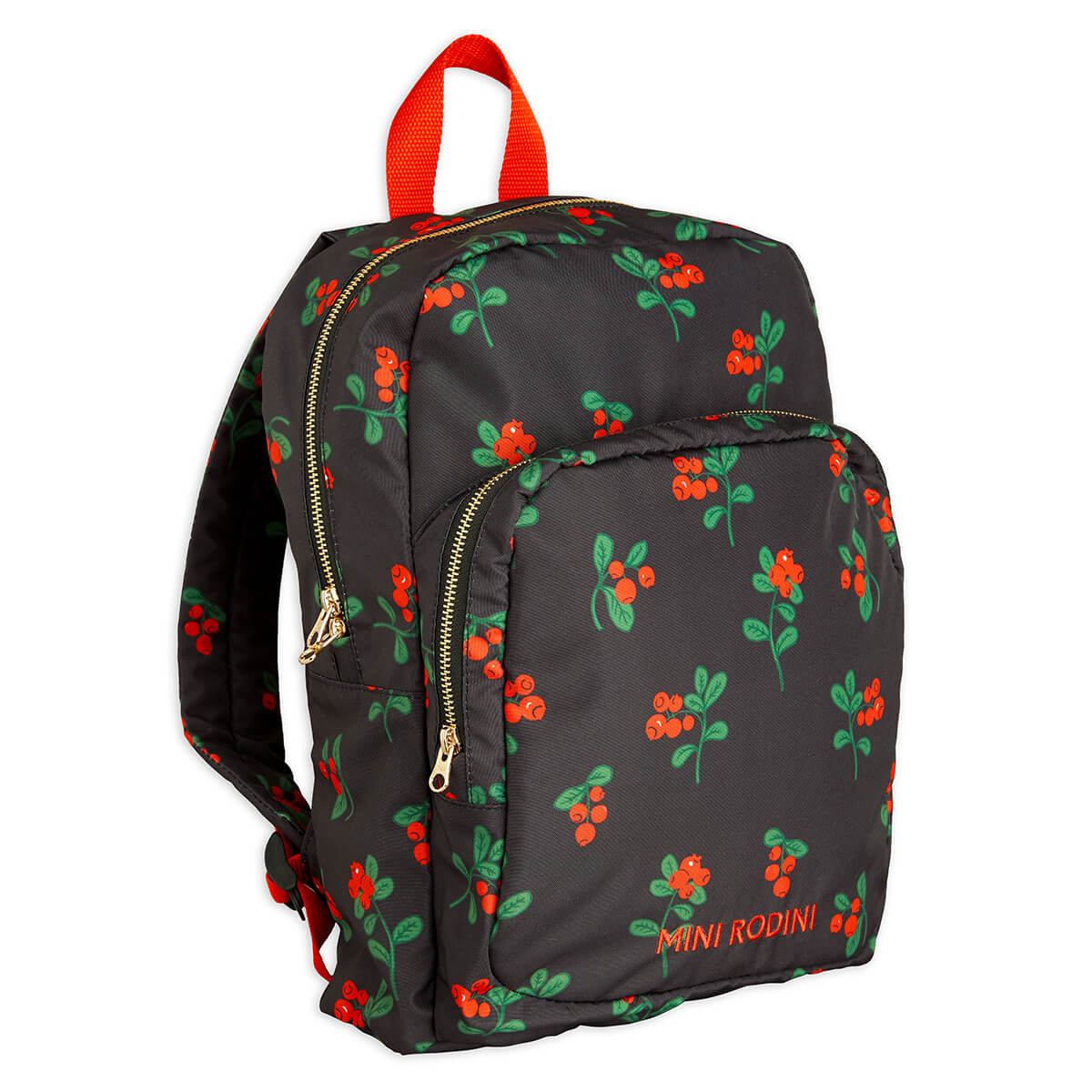 Lingonberries AOP Backpack by Mini Rodini. Black backpack with lingonberries design. Features adjustable padded shoulder straps and two zipper pockets.