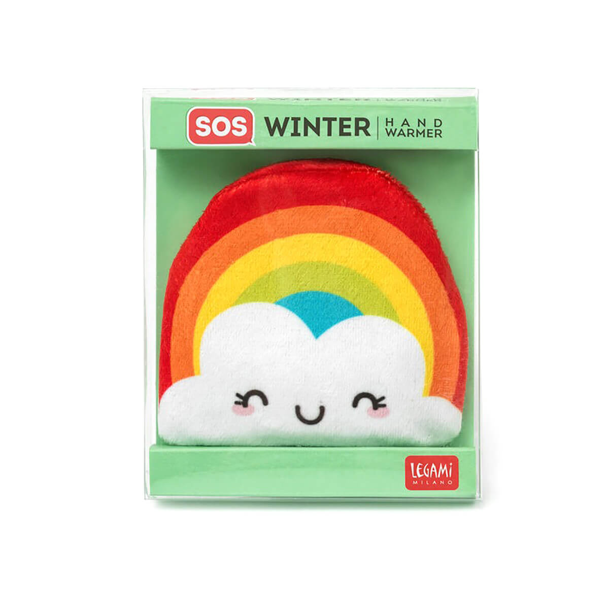Rainbow SOS hand warmer by Legami. Stay warm in colder months with this cute rainbow shaped hand warmer. Gives an instant sensation of heat when activated, press the metal plate and wait for it to heat up, after which it will stay warm for about 30 minutes. To reuse, remove its outer cover, wrap it in a cloth and place in a pan of boiling water for 5 -10 minutes, until the contents of the hand warmer turn into liquid. Comes with full instructions.