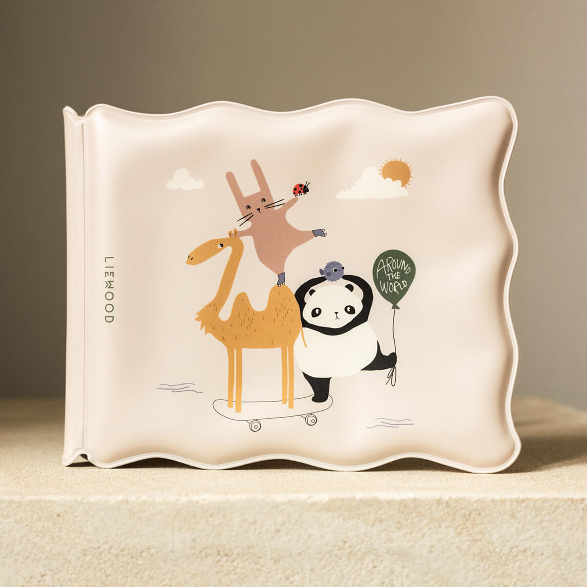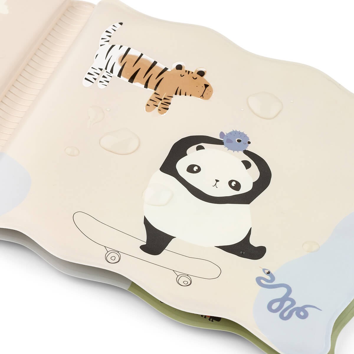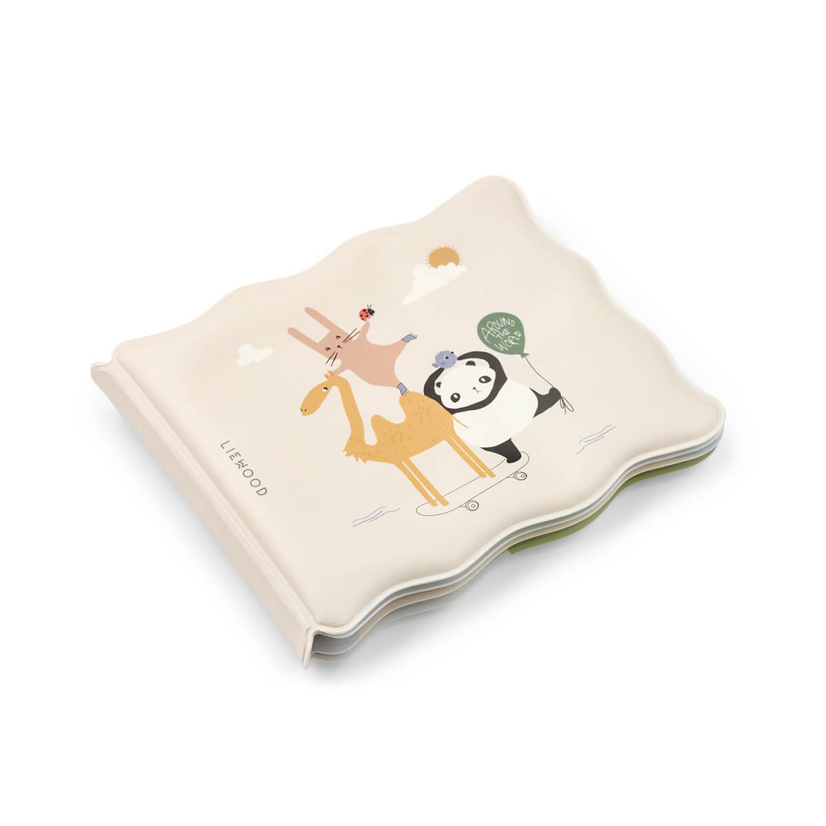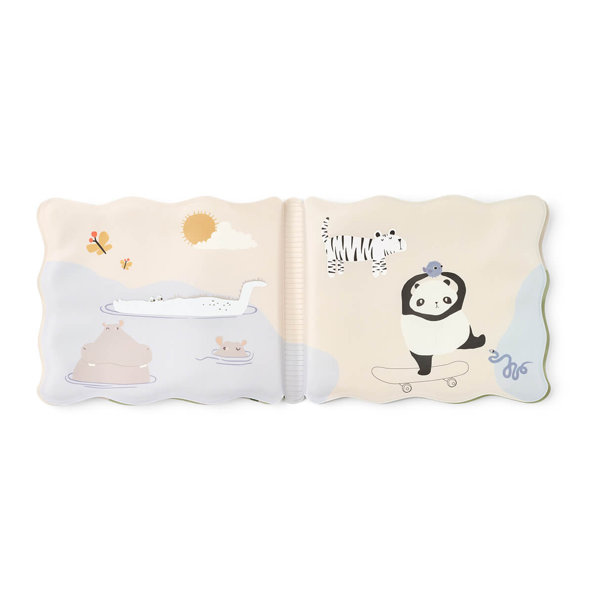 Waylon Magic Water Book by Liewood. Magic water colouring book with fun printed elements on each side to tell a story, which changes colour when in water. The book has a light filling and floats in water.
