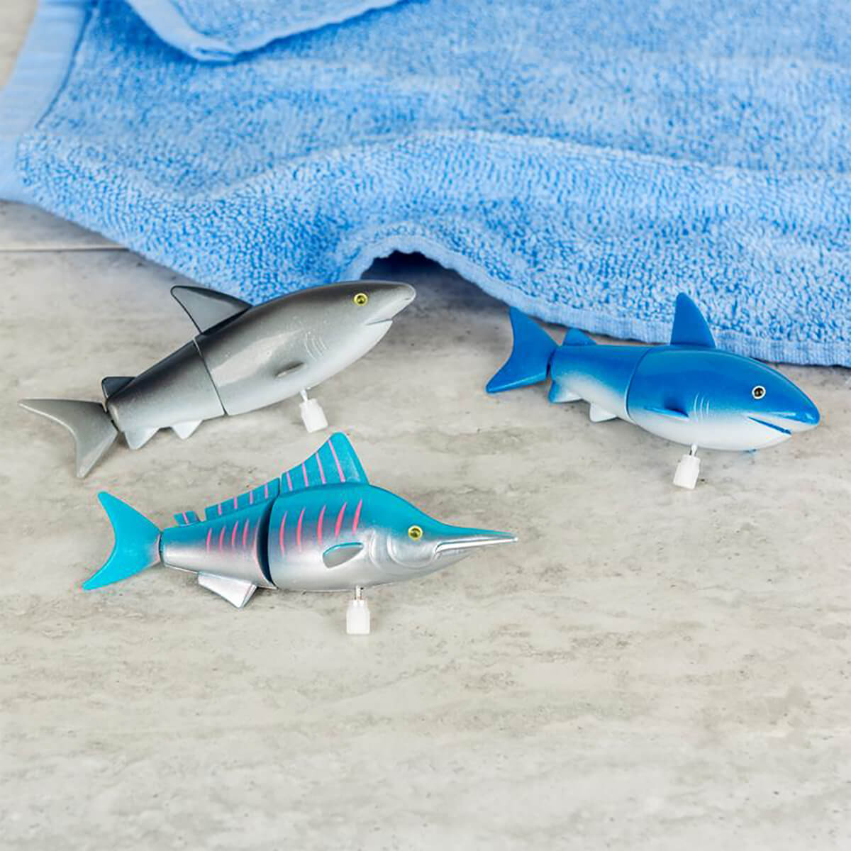 Wind Up Toy by Rex London. Get ready for fun in the water! These wind-up swimming fish are perfect for entertaining children in the bath or paddling pool. Simply wind up the clockwork mechanism, and release in the water to send the fish whizzing around. These wind-up toys are ideal for stocking fillers or party bags. The fish are sold assorted in three varieties: marlin, grey shark, and blue shark. You will be sent one of these at random.