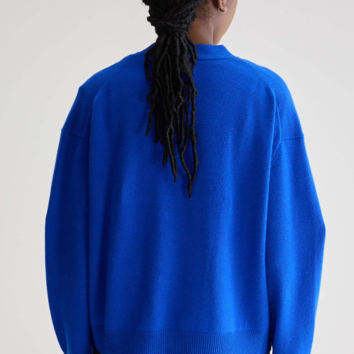Gakkin V-Neck Cardigan in Lazuli by Bellerose. Oversized V-neck cardigan with long sleeves and ribbed edges, crafted in an interlock knit from prairie green wool and cotton.