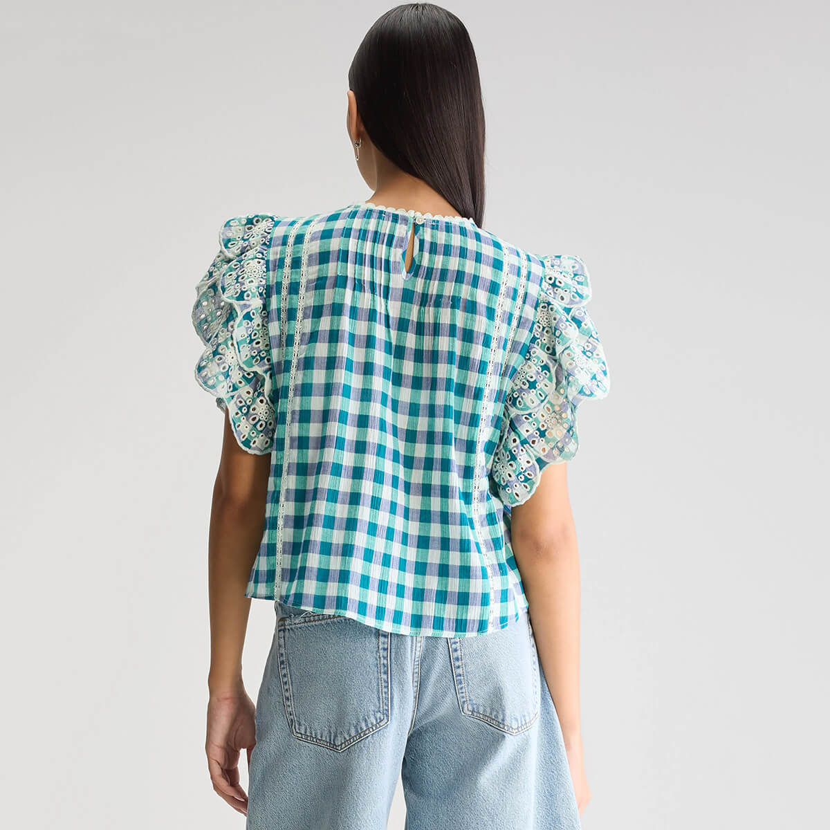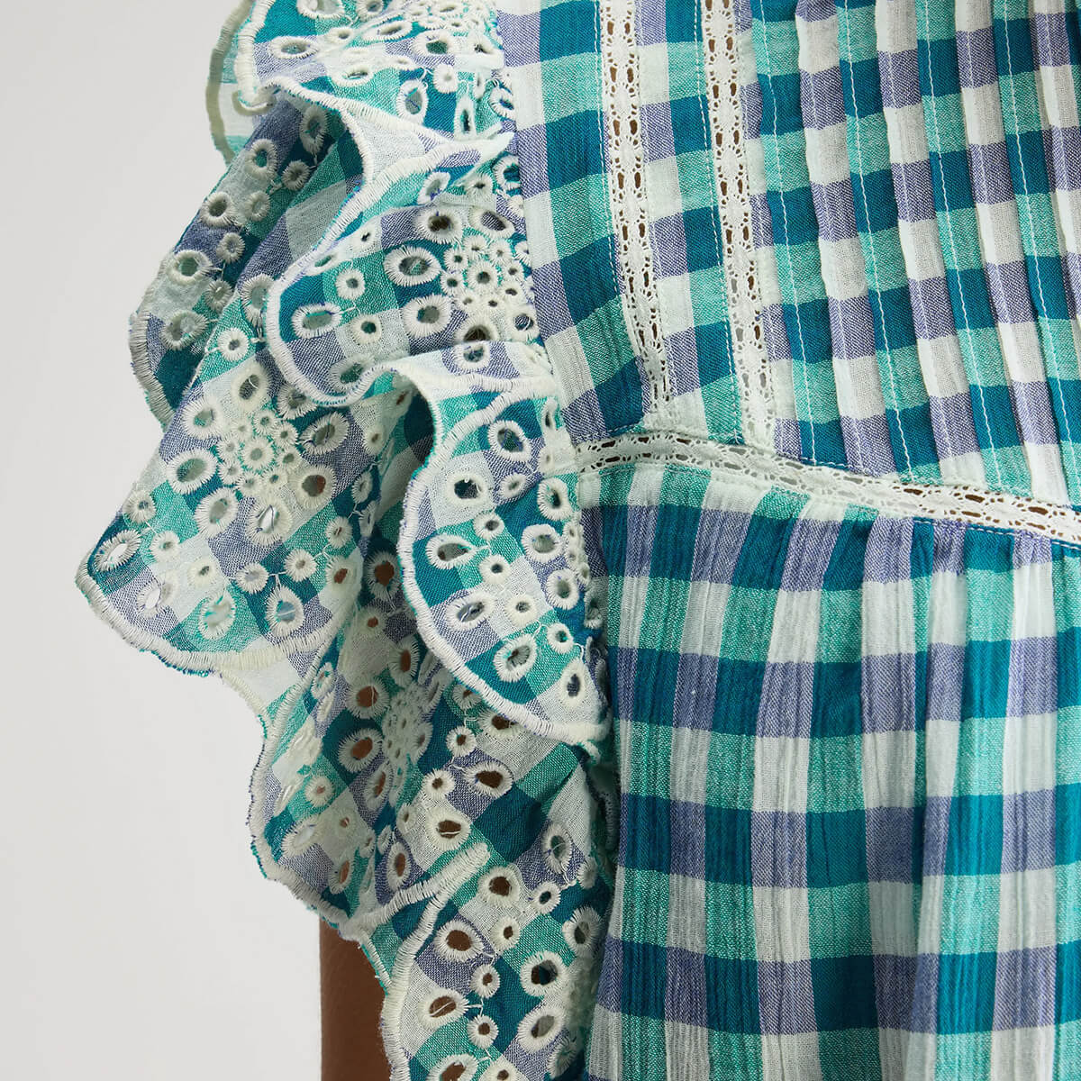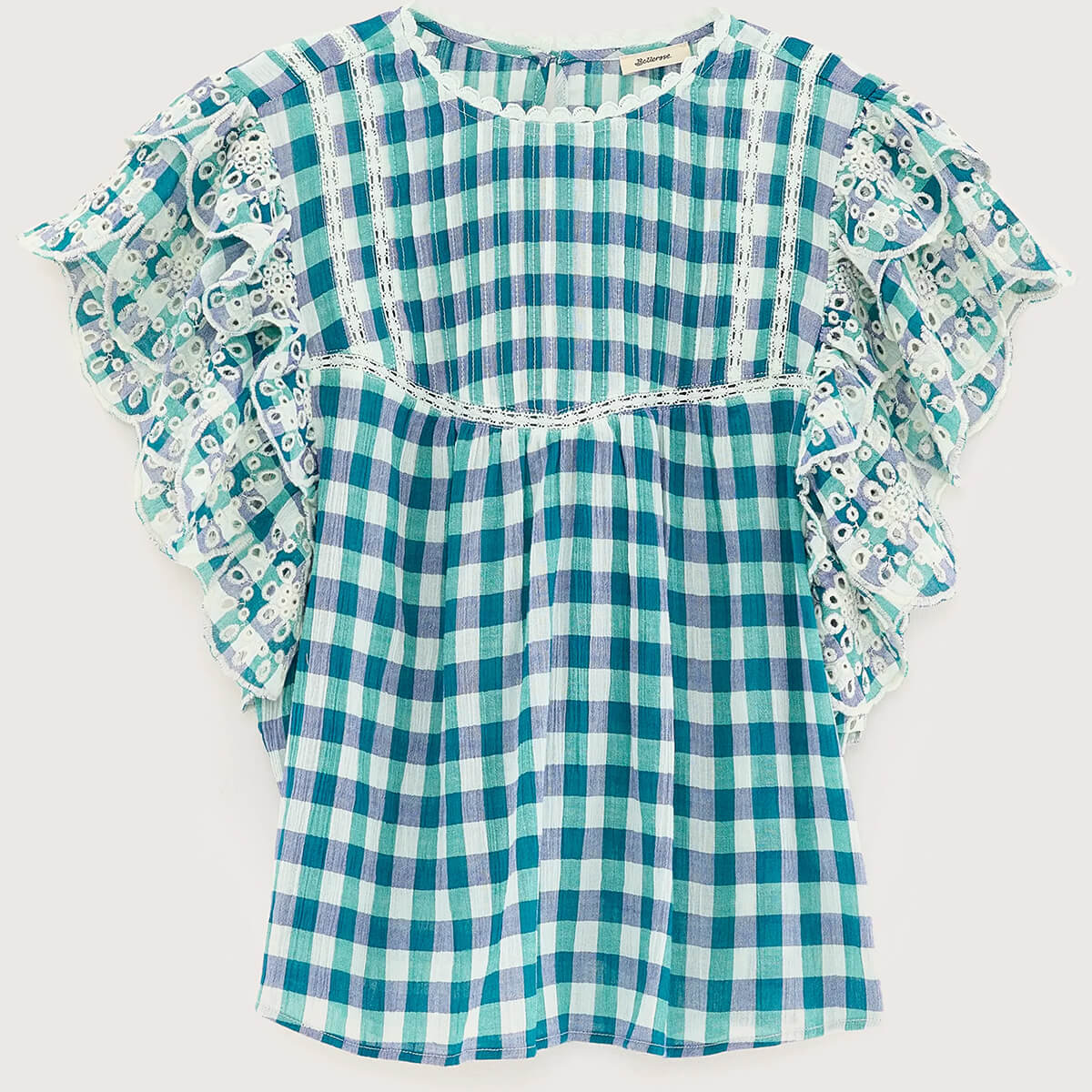 Hudalla Embroidered Blouse by Bellerose. Romantic blouse blending delicate embroidery with a check print. Featuring scalloped edges and lace detailing.
