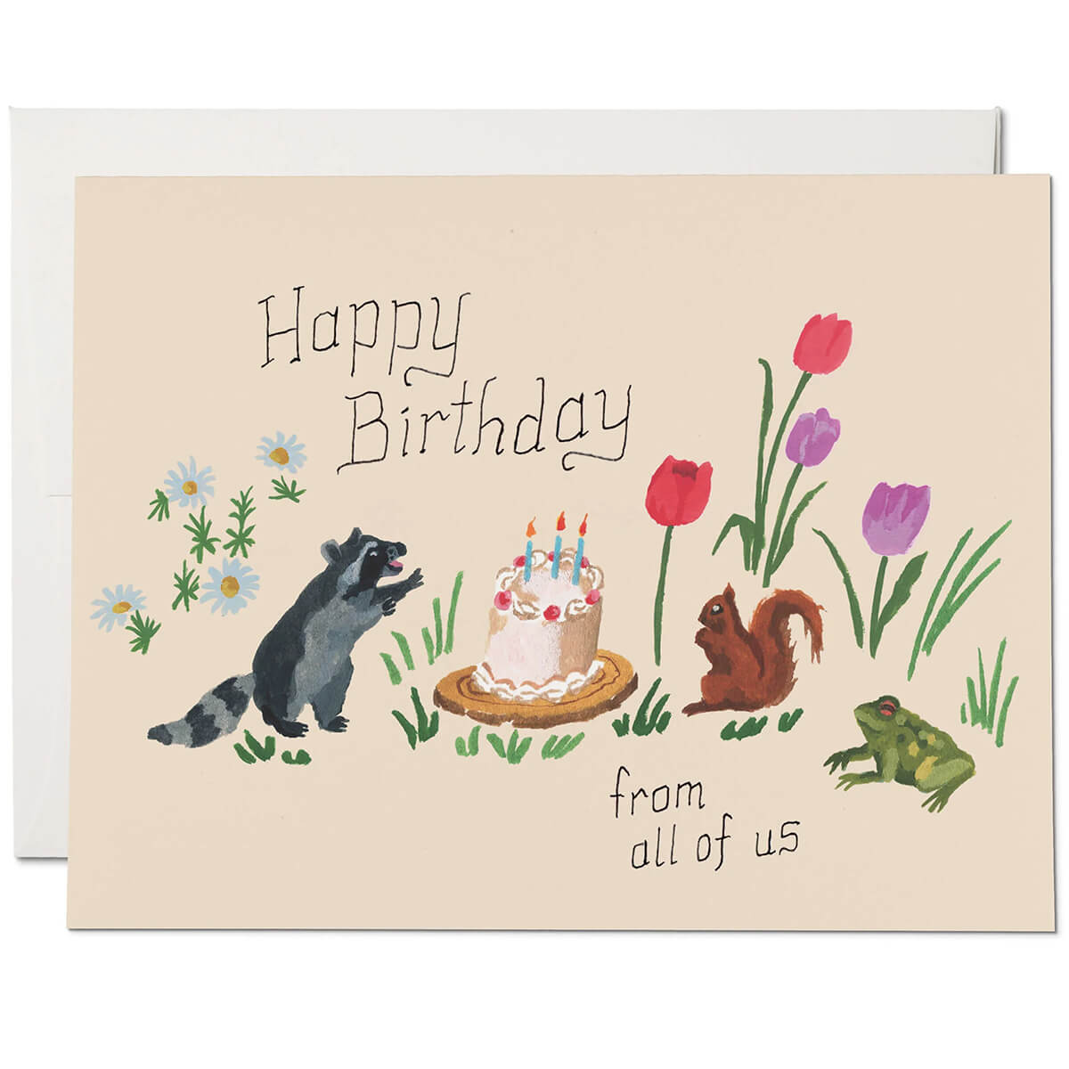 Birthday critters greetings card by Red Cap Cards. Features an illustration by Danielle Kroll. Printed in the USA on heavyweight card stock. Blank inside with white envelope.