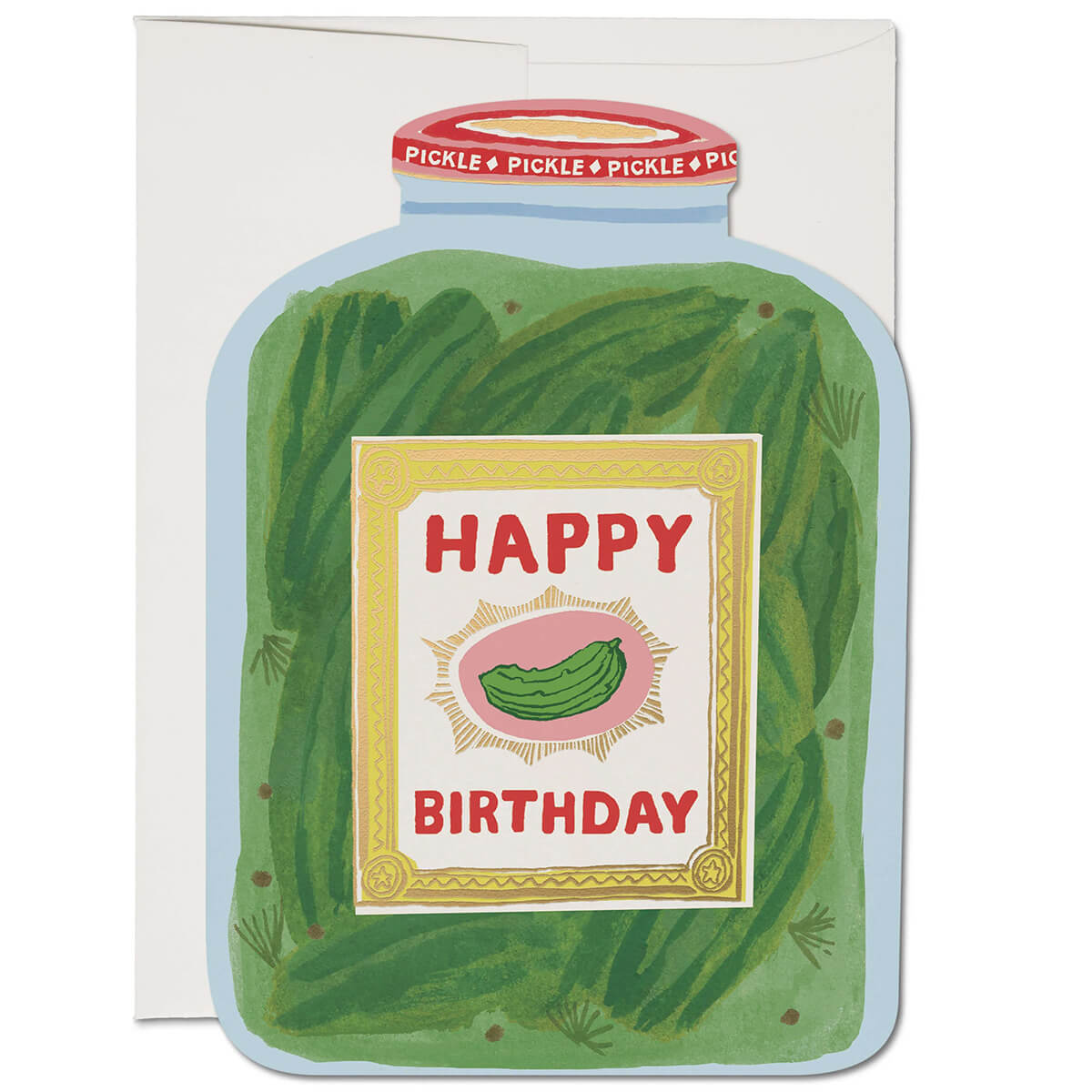 Pickle die-cut shaped birthday greetings card by Red Cap Cards. Features an illustration by Danielle Kroll. Printed in the USA on heavyweight card stock with foil lettering. Blank inside with white envelope.