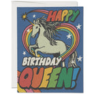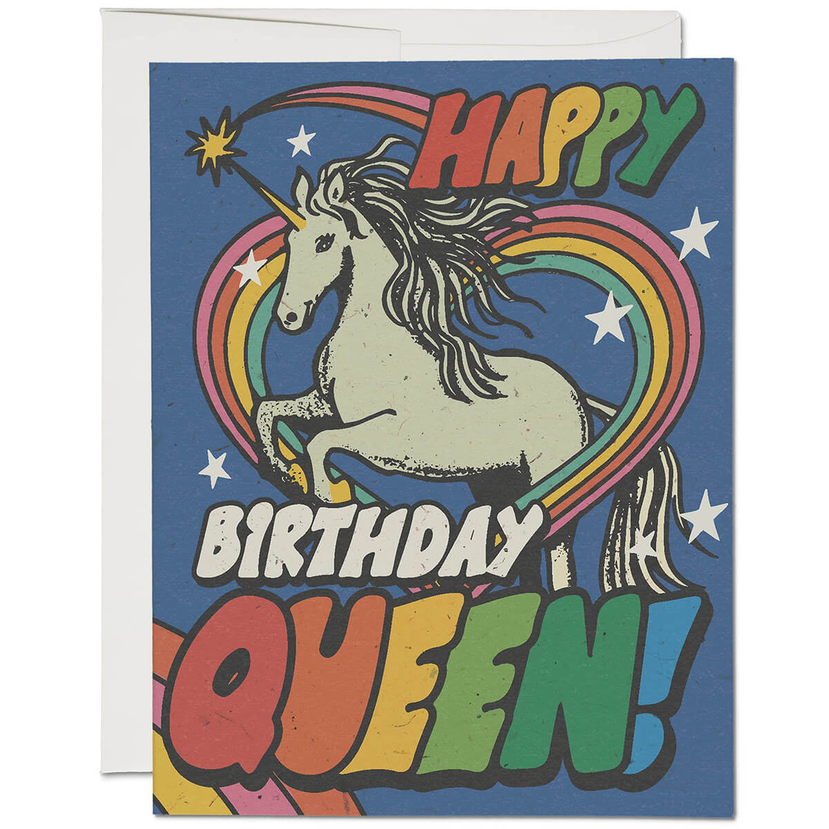 Unicorn queen birthday greetings card by Red Cap Cards. Features an illustration by Kevin Story Mintern. Printed in the USA on heavyweight card stock. Blank inside with white envelope.