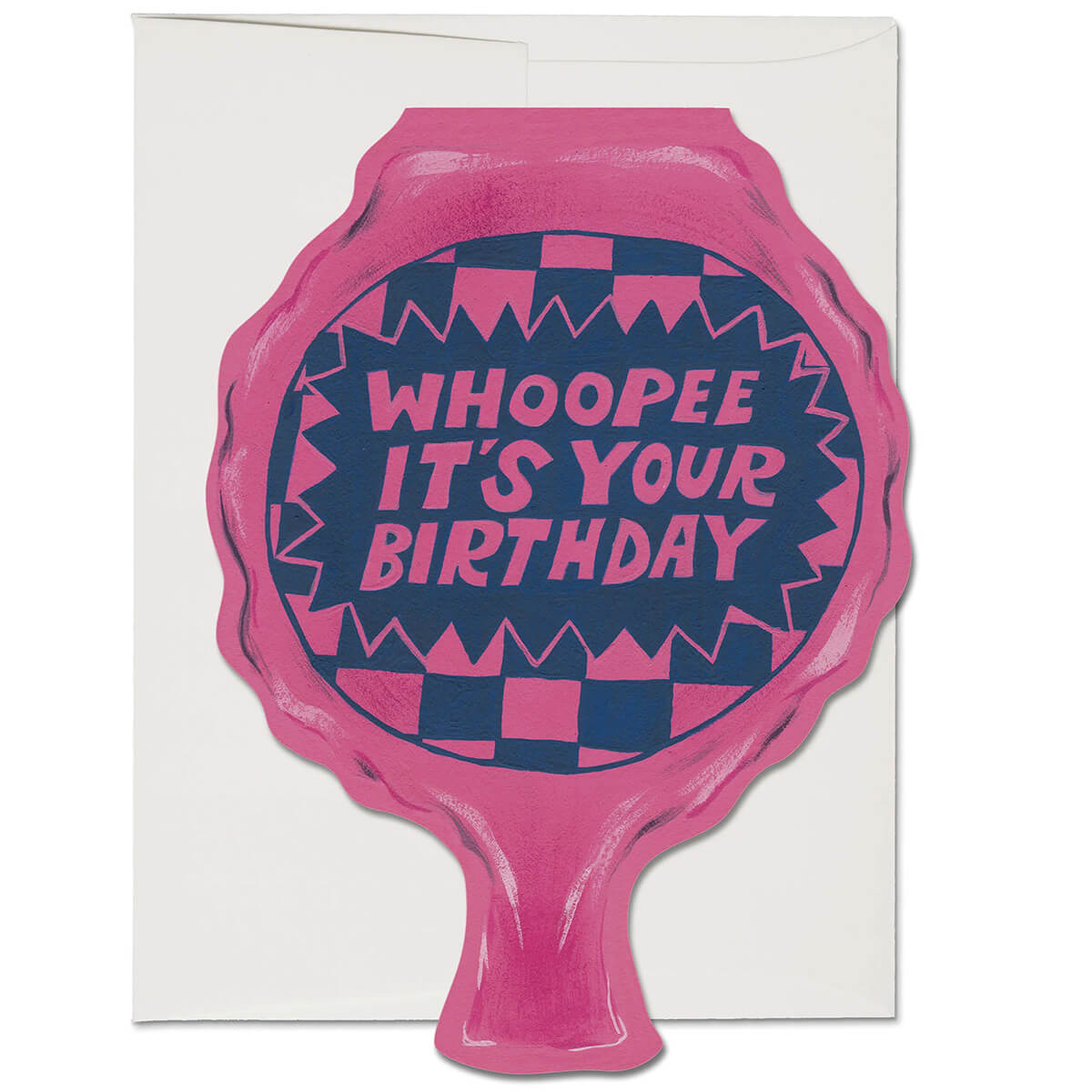 Whoopee cushion die-cut shaped birthday greetings card by Red Cap Cards. Features an illustration by Krista Perry. Printed in the USA on heavyweight card stock with foil lettering. Blank inside with white envelope.