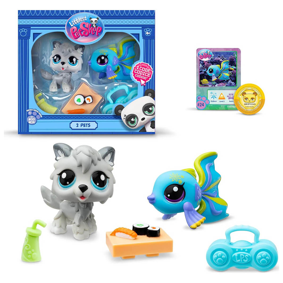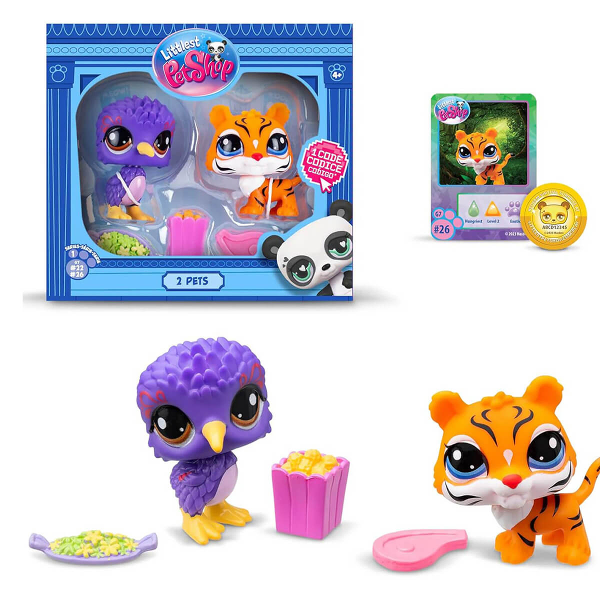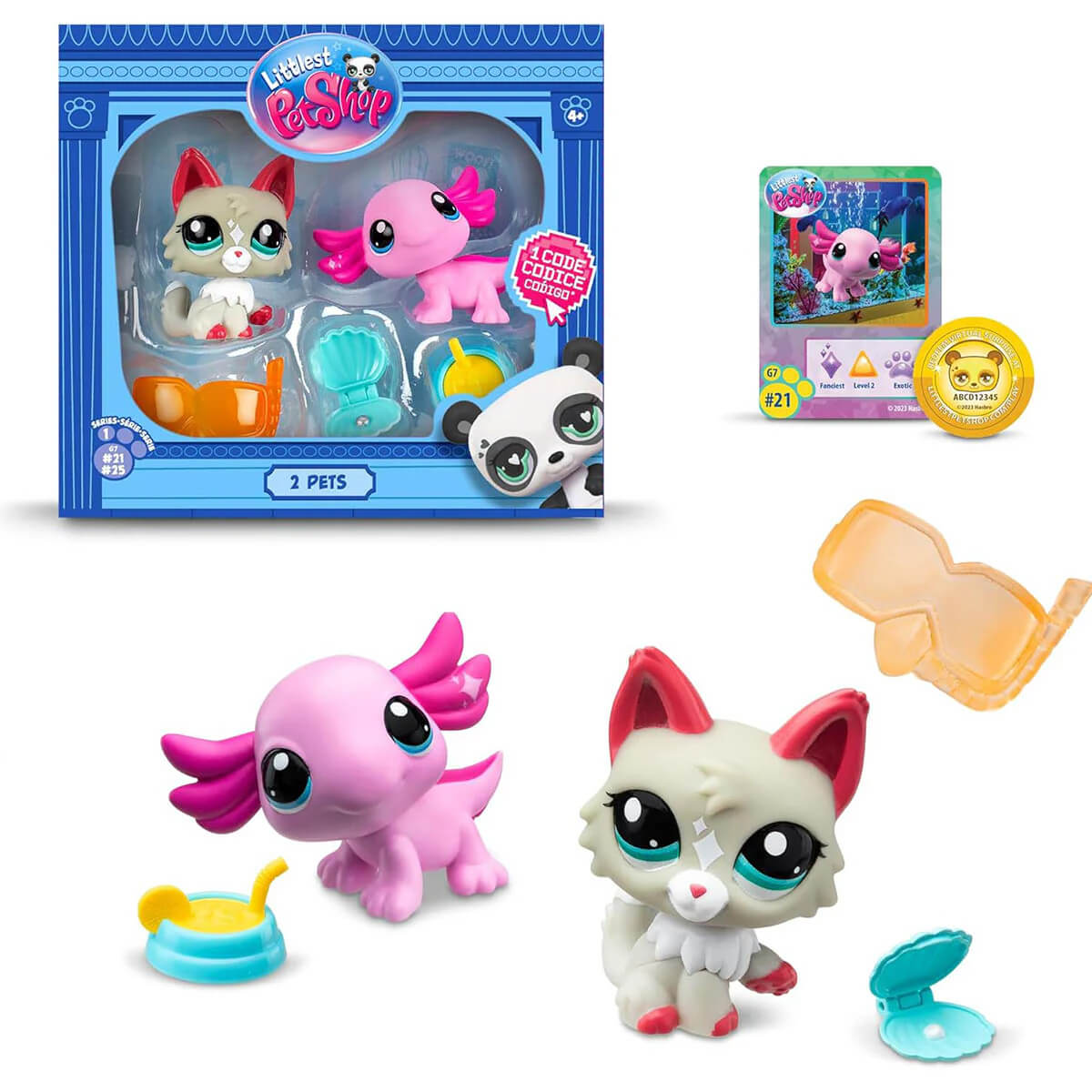 2 x pets, collector card, 3x accessories, virtual play coin.