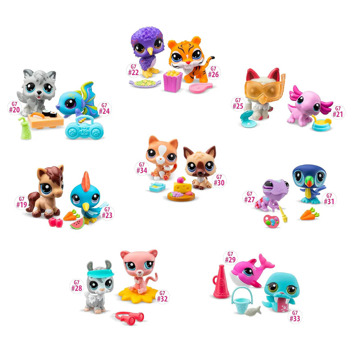 Littlest Pet Shop Pet Pairs 2 Pack by Basic Fun. Set of 2 cute Littlest Pet Shop animals Each Pet Pair comes with two colourful, bobblin’ pets that are packed with personality and a collector card that reveals your pets' unique personality, level, and rarity - will they be the sassiest, fanciest, or something else? Use the code on your collector coin to unlock digital goodies like gems, accessories, or other surprises.