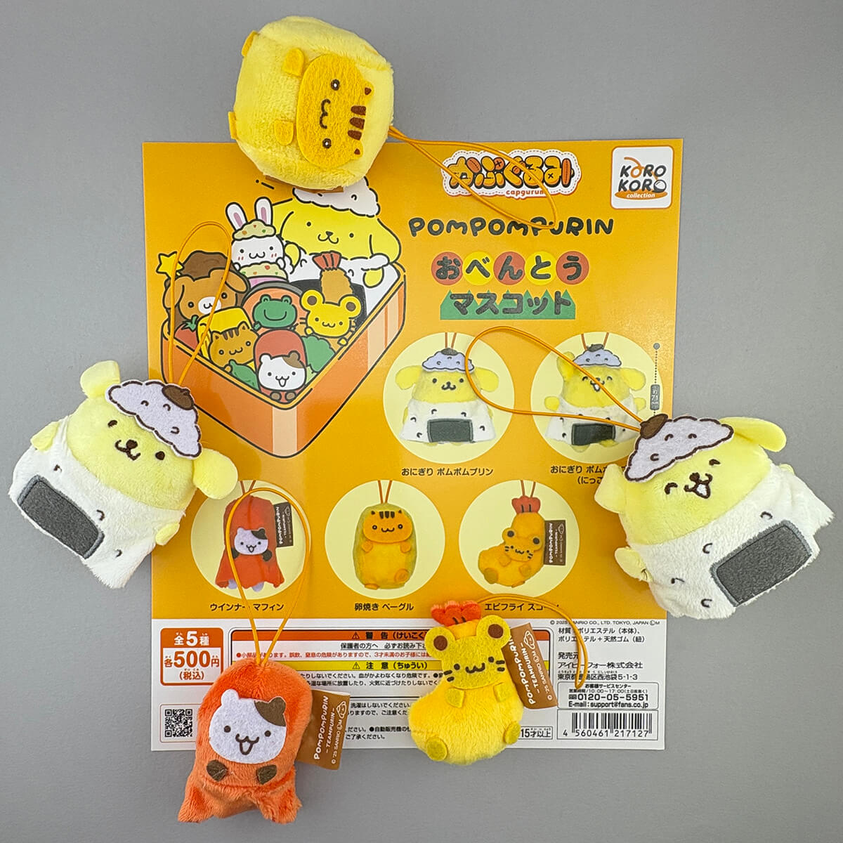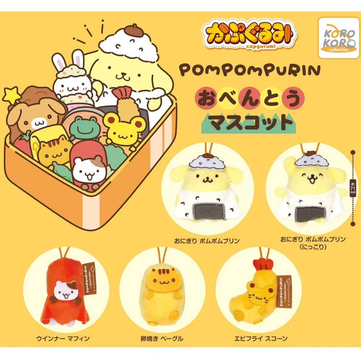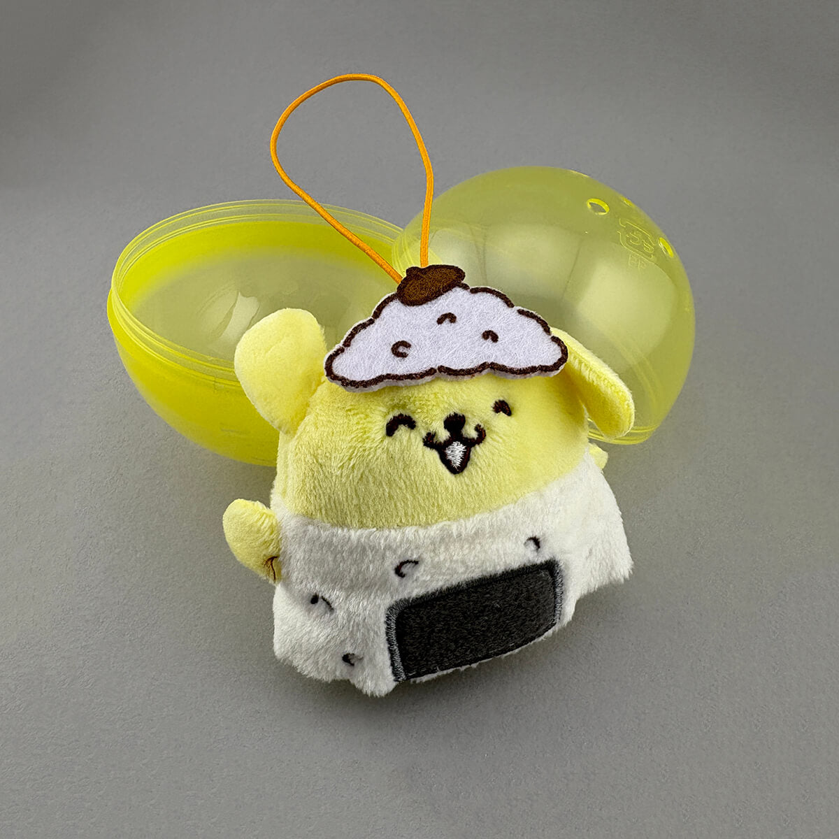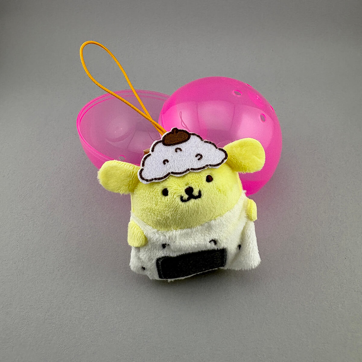 Sanrio Pompompurin Bento Box Mascot Capgurumi Gachapon Capsule Collectible by Koro Koro. Highly collectible and authentic Japanese gachapon capsule containing one of five different bento box themed Pompompurin Capgurumi mascots! Each character is made from a soft plush material and comes with a little elastic loop to attach it to your bag or keys. Capgurumi is a combination of the words capsule and gurumi which is Japanese for stuffed toy.