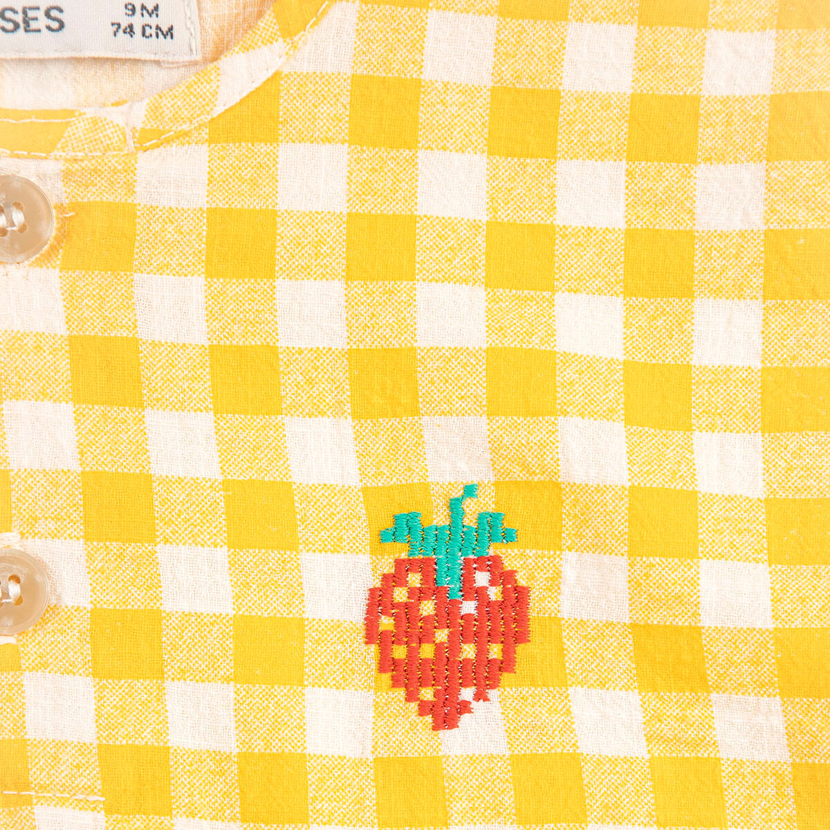 Pixel Strawberry Vichy Woven Baby Blouse by Bobo Choses. Yellow shir designed with short sleeves, dropped shoulder, front button fastening, embroidery, a round neck and a relaxed fit.
