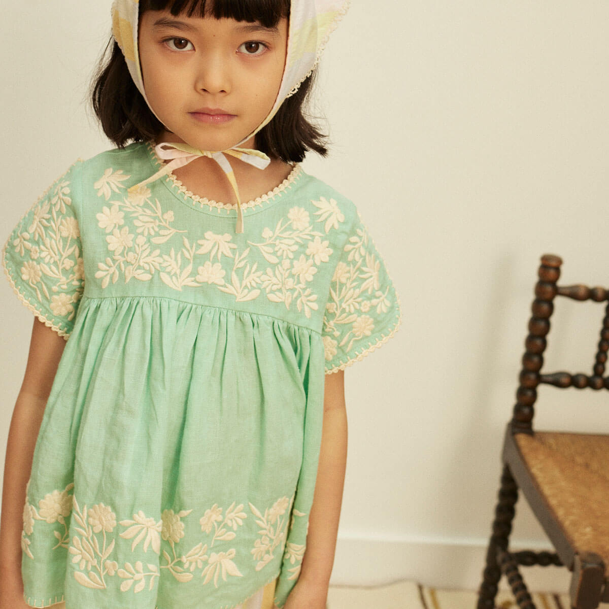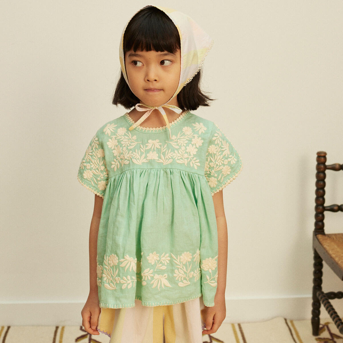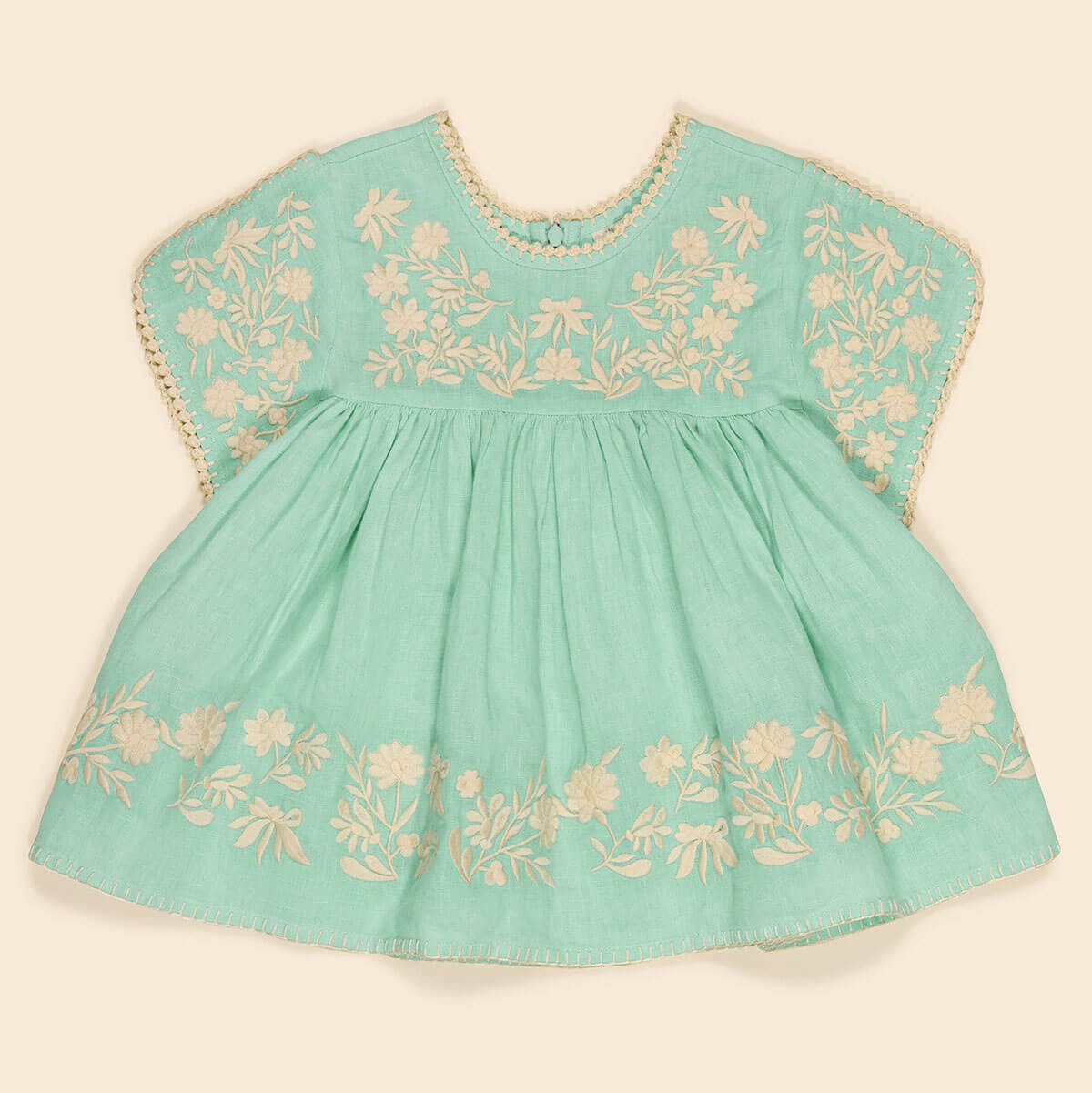 Stevie Blouse by Apolina. The beloved signature Stevie style is reimagined as a blouse in the season’s key highlight colour ‘seaglass’. Featuring Apolina’s classic folk-inspired contrast embroidery at chest, arms and hem, crochet trim at neckline, shoulder and armhole, and blanket stitch finish at hem. Invisible zip closure at back.